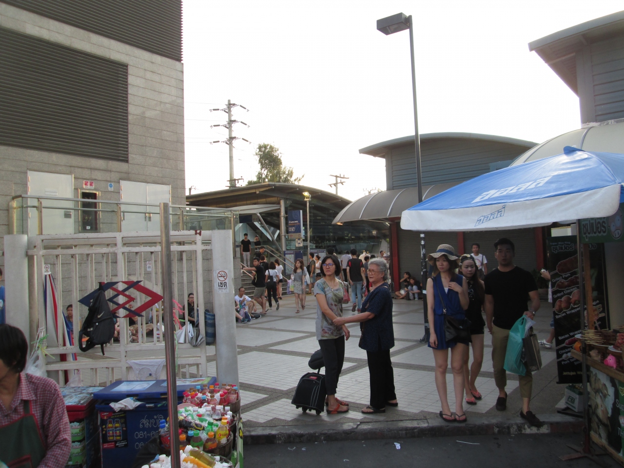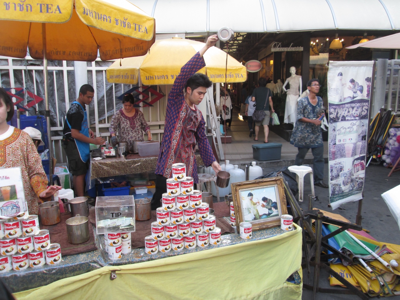 土日はウィークエンドマーケットが開催され、それに合わせてガムペーンペット駅の2番出口付近から屋台が出ています。訪問した日はコーヒーののみもの屋台が出ており、おいしそうなコーヒーのパフォーマンスを行っていました。