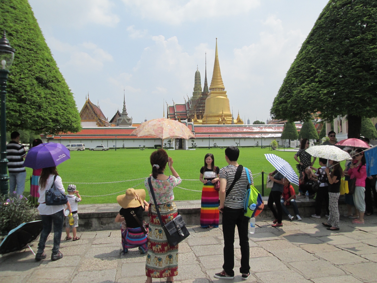 王宮の北側にある広場です。緑豊かで広大な敷地に黄金に輝く寺院が見えます。観光客が記念撮影するポイントでもあります。ガイドさんによると、ここのポイントでは観光客を狙ったスリが多いので所持品には注意が必要です。
