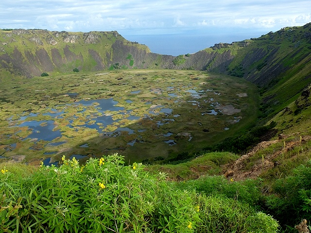 展望台から見下ろすラノ・カウ火口湖の直径は1600mあまり、火口壁の高さは200mあまり。