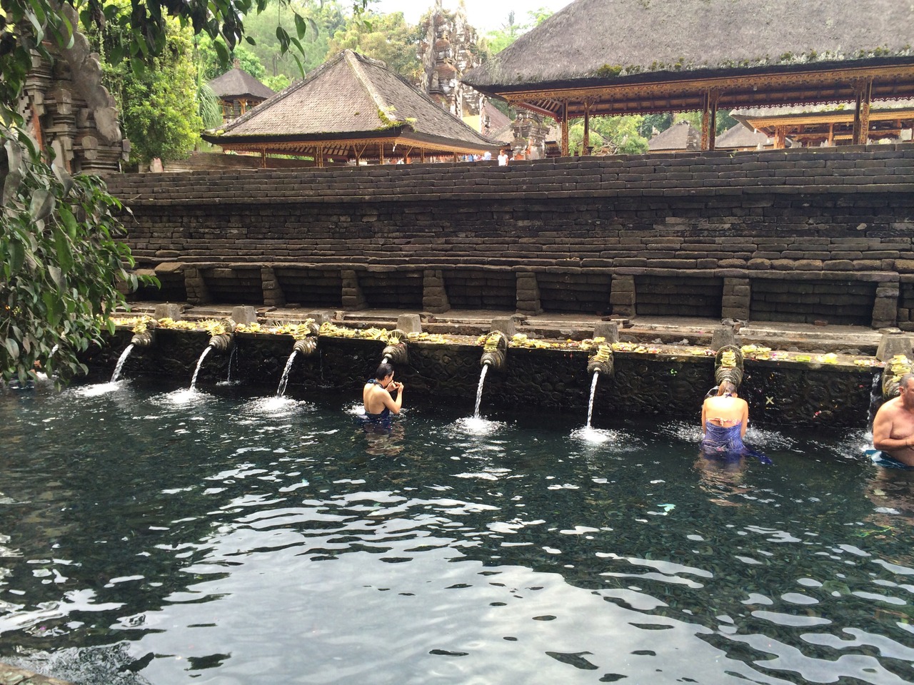 聖なる湧き水がプール(池)のなかで、湧き出ています。その水が、下段のプール(池)になだれ込んでおり、多くの人が手前で服を脱いで、水着+シャツ姿で下段のプールに入り、水をかぶりお祈りをしていました。祈りをささげるなら、服の替えが必要です。