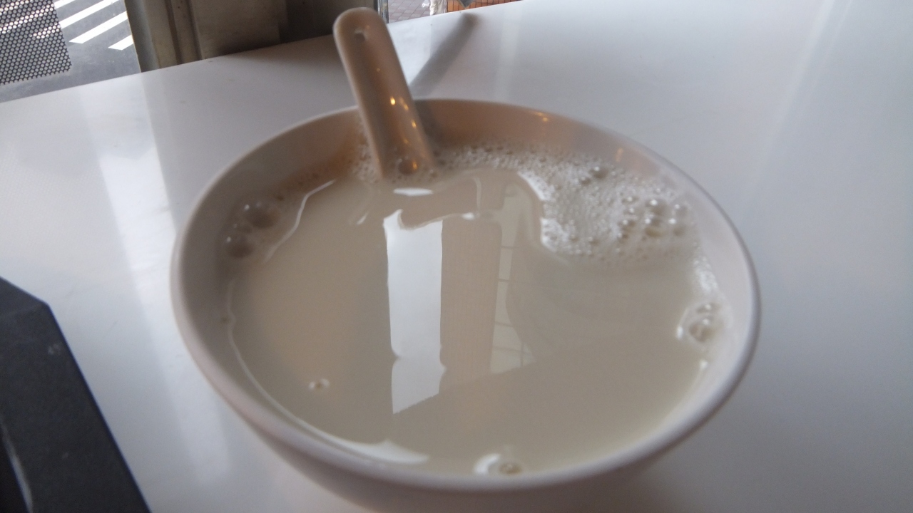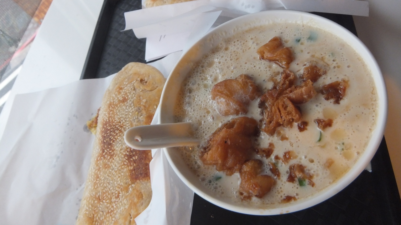 私は、しょっぱい豆しゃんと、薄い焼餅を食べました。友人は甘い温かい豆乳を