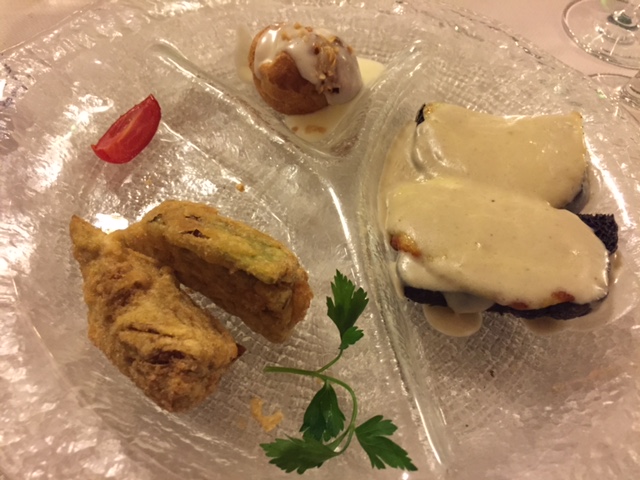 アーティチョークのフリット、アンチョビの黒パンのペコリーノ掛けと、シューの小さいのはカリフラワーを使ったこのお店の創作だそうです。