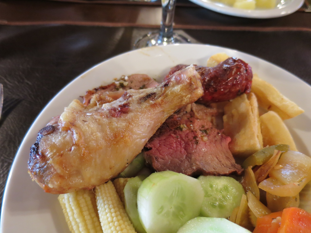 チキン、ソーセージ、肉食べ放題です。焼きたてで肉もやわらかくておいしかったです。野菜、フルーツ、パスタなど種類も豊富でした。雰囲気も落ち着いていて、観光客でいっぱいでした。店の外も緑が多く芝になっていてゆっくりできました。マテ茶はお勧めです。