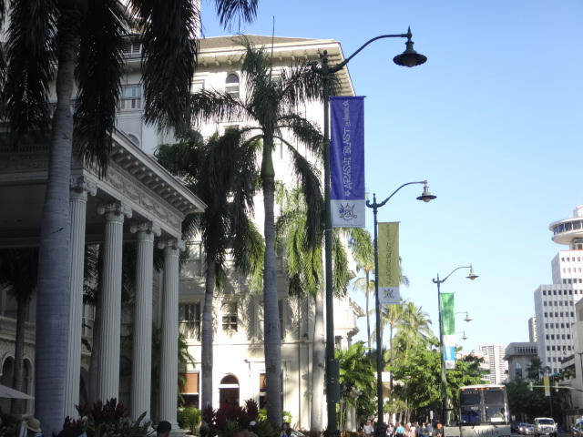 観光客には外せないカラカウア通り。宿泊はいつもワイキキエリアなので、毎日通る道です。朝早い時間の人気の少ない時に散歩するととても気持ちがいいです。雰囲気が良いのはモアナサーフライダーからカピオラに公園までの区間だと思います。ちょうど嵐のハワイコンサートのフラッグが、カラカウア通りをジャックしていました。