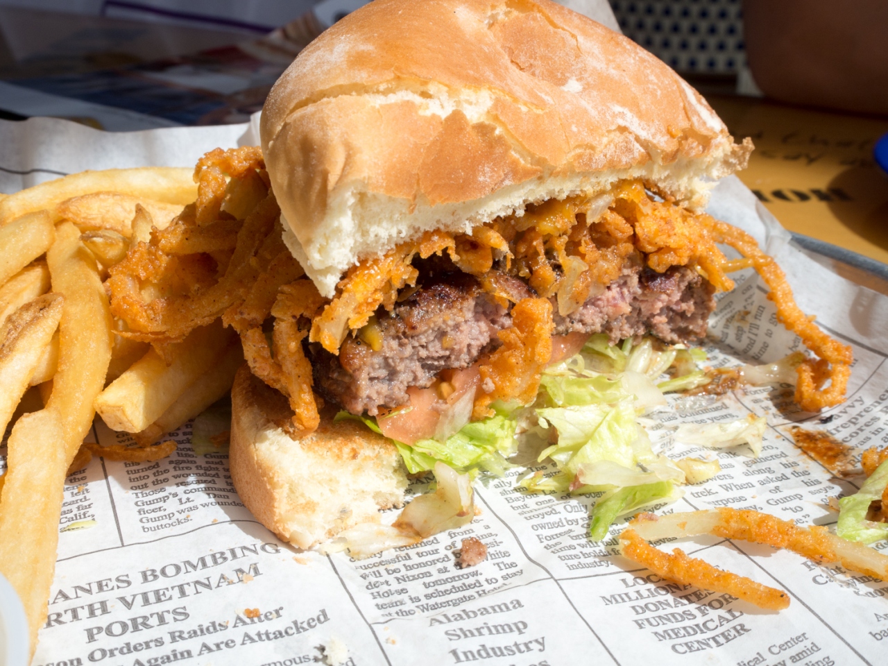 アラモアナショッピングセンターでちょっと疲れてビールとか飲んでみたくなったらショッピングセンターの最上階へ行けば、食事できる店やバーがあります。一階のフードコートではアルコールが無いので、がんばって4Fまで登りましょう。この店のバーガーはやっぱり大きいので二人で1つでいいかな!ビール 写真のピリスナー量の少ない方がお得です/