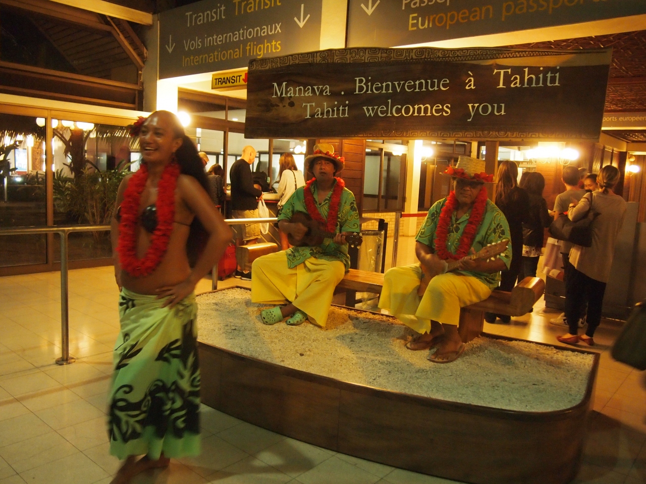 深夜0時頃到着の飛行機でしたが夜中にもかかわらず開催されていました。疲れてましたが疲れが吹っ飛ぶくらい「タヒチに来た~~!」とテンション上がりました。飛行機を降りて空港に入ったところで入国審査を待ちながら鑑賞できます。入国審査は結構並んだような気がしますが、おかげであまり気にならなかったです。