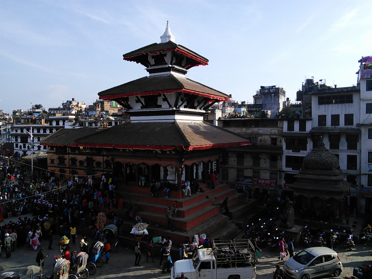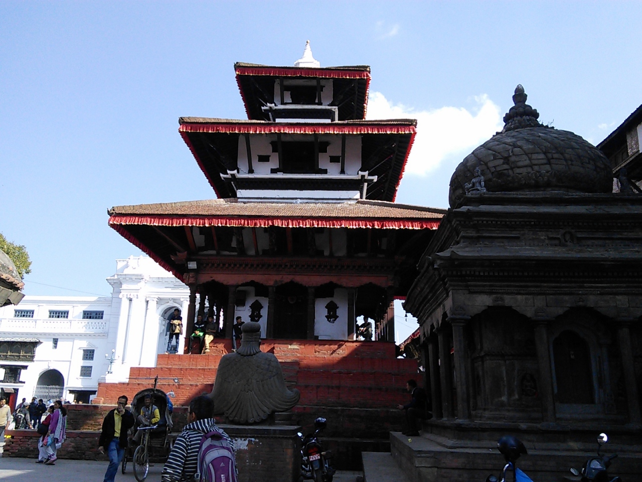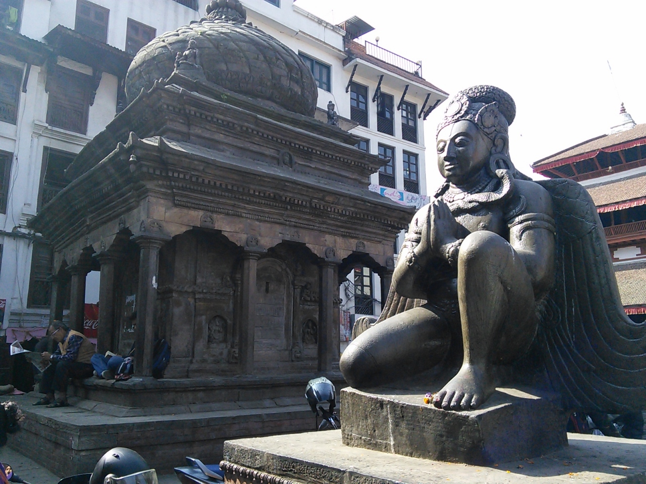 壁が白く塗り直されているせいか他の寺院に比べると美しくすっきりとした印象を受けます。といっても違いはあまりないので西正面に回ってみましょう。手を合わせ片ひざをついたガルーダ像があります。ヴィシュヌ神の乗り物でもありとても力強い姿をしています。ナラヤン寺院との関係はよくわかりませんがこちらのほうが見応えかあります。
