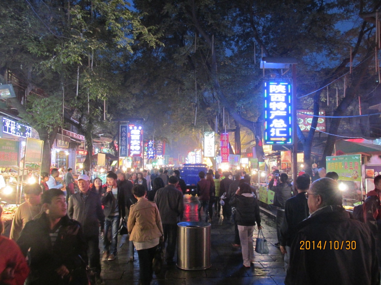 西安市の中心鐘楼から西へ徒歩で100mほど、鼓楼を通過すれば「西安回民街」という歴史感漂うイスラム街が見えます。ここには、外形や歴史がそれぞれ異なった約十棟のイスラム寺があり、約四万人の回族の人が寺の周りに住んでいます、イスラムの古い宗教伝統と生活習慣が守られ受け継がれています。 西安市で有名な北院門の「美食街」、を楽しんで下さい。西安回族の美食はほとんどここにあります。例えば、牛羊肉泡[食莫](小麦粉で作った食品で、細かくほぐして熱いスープをかけてふやかした食べ物)、灌湯包(スープを入れるパンの一種)、清真ギョーザ「酸菜炒米(醗酵させた酸っぱい白菜の漬け物で作る焼き飯)、牛や羊の肉をあぶって食べる焼肉、各種の軽食やおやつなど、忘れないくらい美味しい食べ物がいっぱいあります。ここには、舌を喜ばせ、旅の趣もいっぱいあるので、西安へ行けばこの街は絶対見逃せません。 但しイスラムはアルコール酒類は一切提供しません。冷たいビールが欠かせない人は北院門脇の溌婦魚荘、レストラン。入口のドアに黄色の帯で「本条街唯一漢族酒楼」と書いてあります。イスラムではなく漢族なので酒類を提供出来ます。この街で只一軒ビールが飲めます、しかも冷えたビール(西安では常温のビールが多い)です。