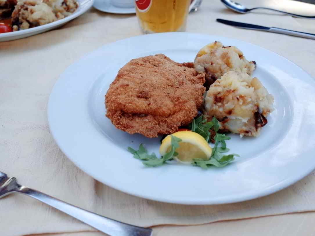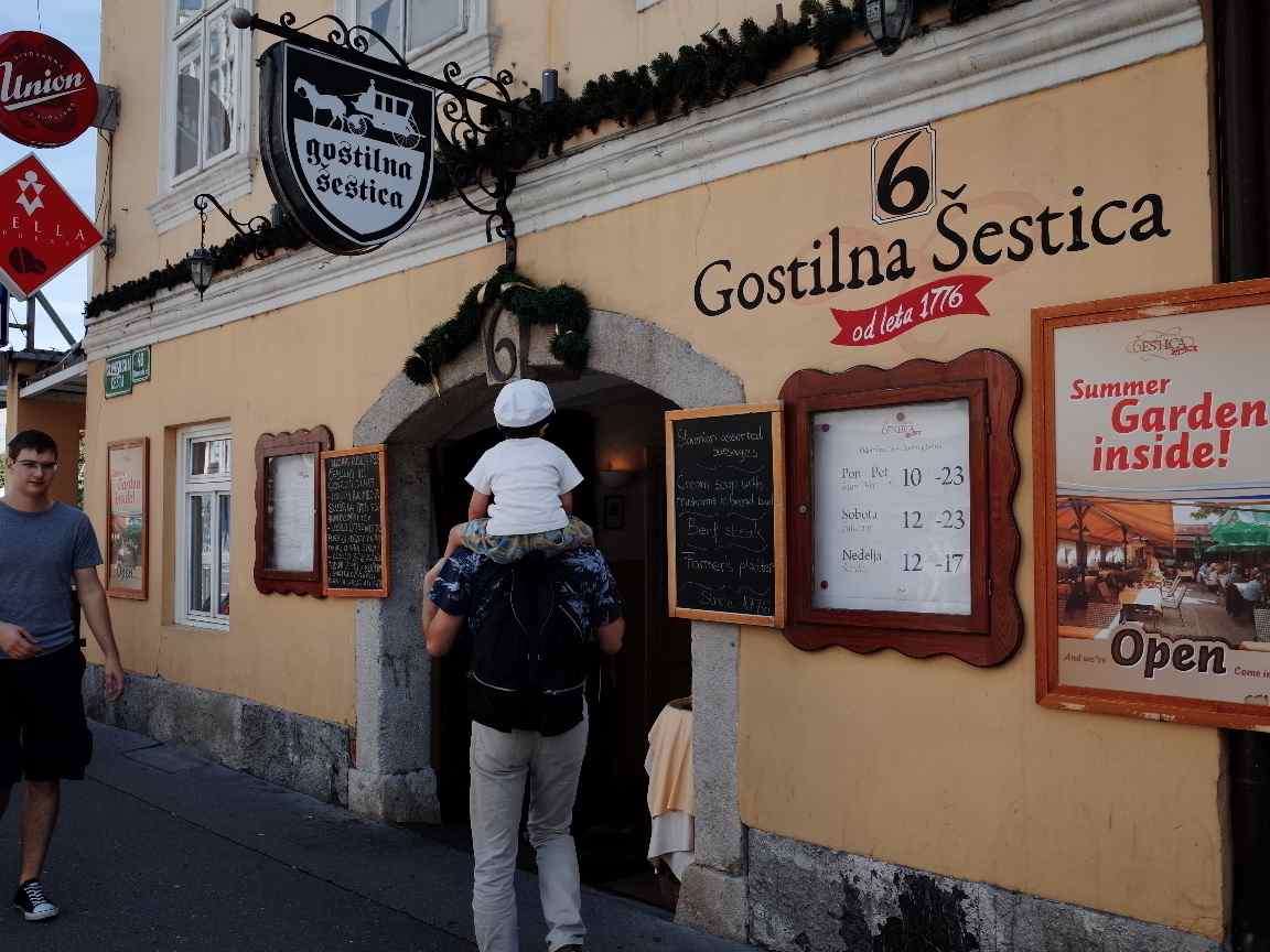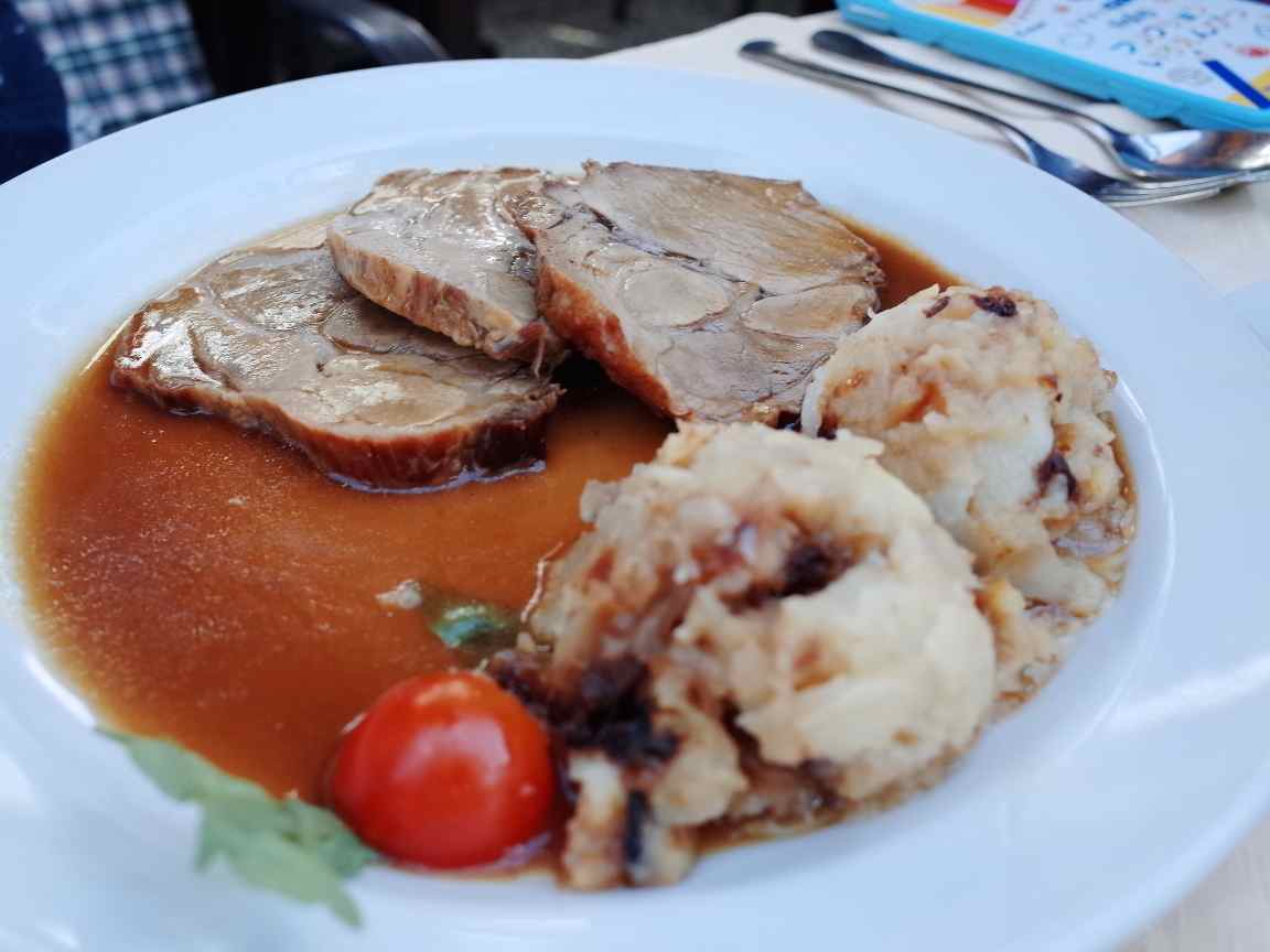私たちが頼んだのは、スロヴェニア名物のキノコのスープ、リュブリャンスカ、豚肉のロースト、ブレッド湖で食べられなかったマス。キノコのスープはパンの器に入っており、具だくさんのスープももちろん美味しいのですが、それがしみたパンも美味しい。女性ならこれだけでもランチの量になりそう。リュブリャンスカはチーズやハムを挟んだ豚肉のカツレツですが、ここのはあっさりしていて美味しい。豚肉は玉ねぎのこっくりしたソースがよく絡み、マスはさっぱりと品のある味。さすが農業国スロヴェニアだけあって、素材はどれも味が濃厚。味付けもくどくなく、大満足でした。