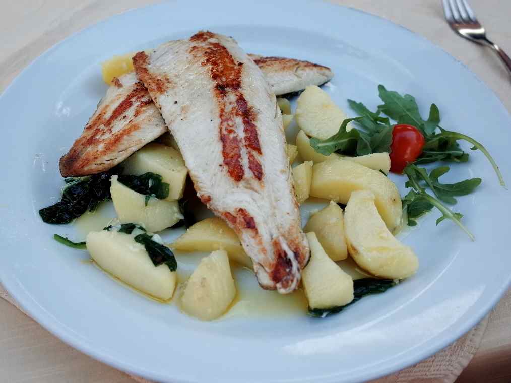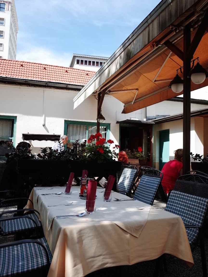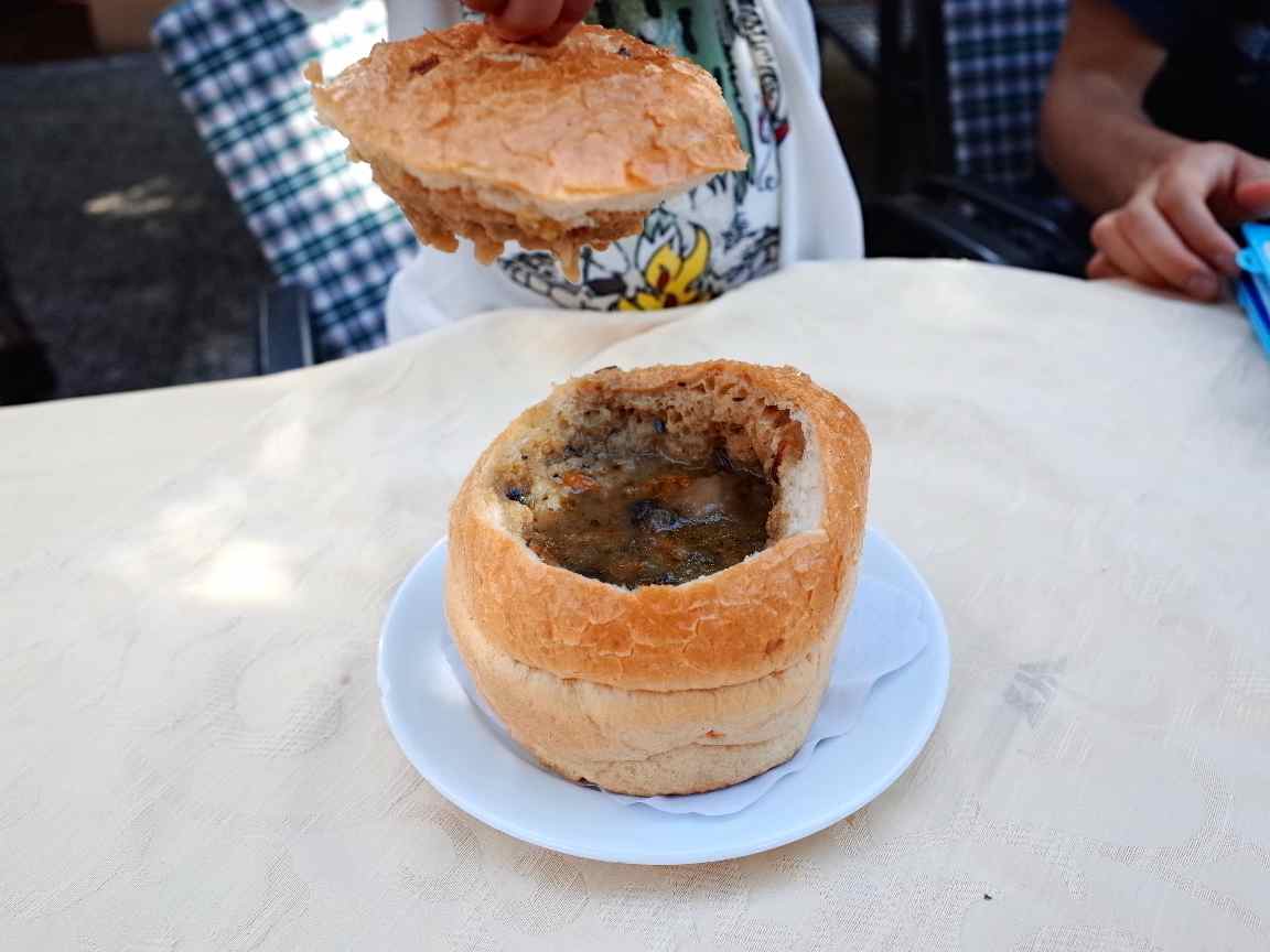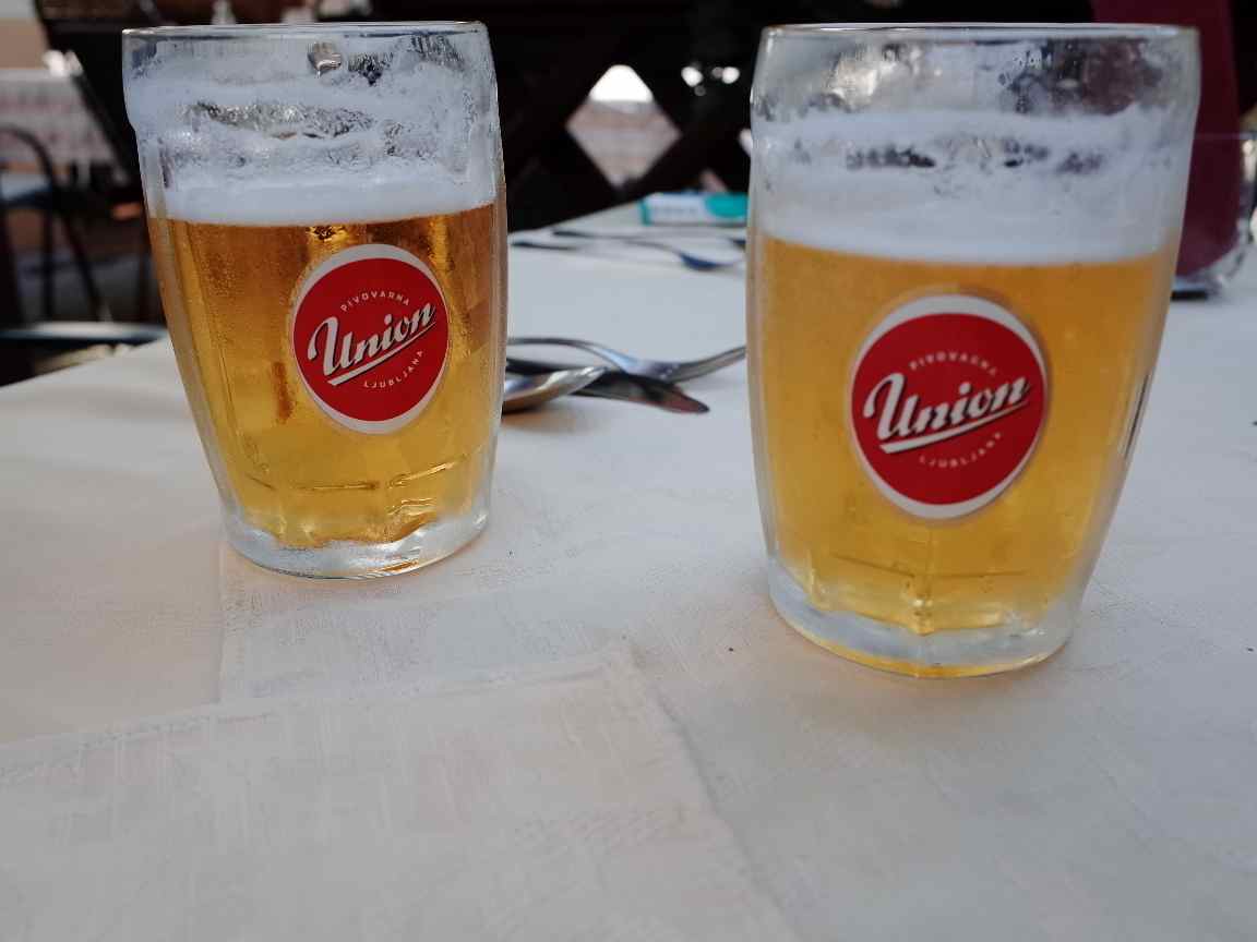 私たちが頼んだのは、スロヴェニア名物のキノコのスープ、リュブリャンスカ、豚肉のロースト、ブレッド湖で食べられなかったマス。キノコのスープはパンの器に入っており、具だくさんのスープももちろん美味しいのですが、それがしみたパンも美味しい。女性ならこれだけでもランチの量になりそう。リュブリャンスカはチーズやハムを挟んだ豚肉のカツレツですが、ここのはあっさりしていて美味しい。豚肉は玉ねぎのこっくりしたソースがよく絡み、マスはさっぱりと品のある味。さすが農業国スロヴェニアだけあって、素材はどれも味が濃厚。味付けもくどくなく、大満足でした。