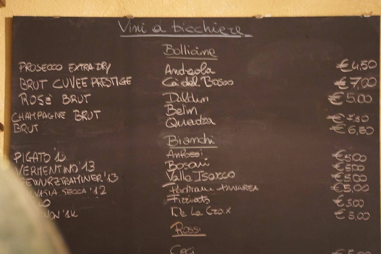 サンタマルゲリータリグレで軽く1杯、アペリティーヴォで利用してもいいし、ボトルを入れてディナーも楽しめるお店です。ワイン1杯頼むとポテトチップスとチーズ、サラミ、生ハム、オリーブのおつまみセットがついてきます。人気のあるお店のようで、常に満席でお客さんを断っていました。