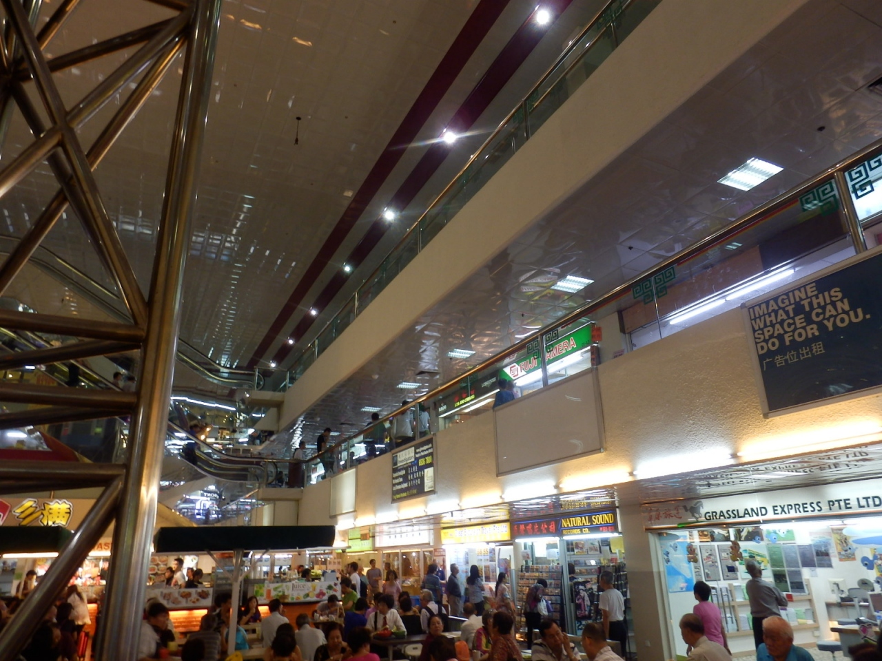 チャイナタウン駅の北側には、低層階はショッピングモールで、高層は団地になっている2つの建物、珍珠大厦(People's Park Centre)と珍珠坊(People's Park Complex)があります。こちらは緑色の建物の珍珠坊です。ショッピングモールの中は中央が吹き抜けになっていて、1階はフードコートになっていました。休日の午後は地元の中国系の方々で大混雑していました。