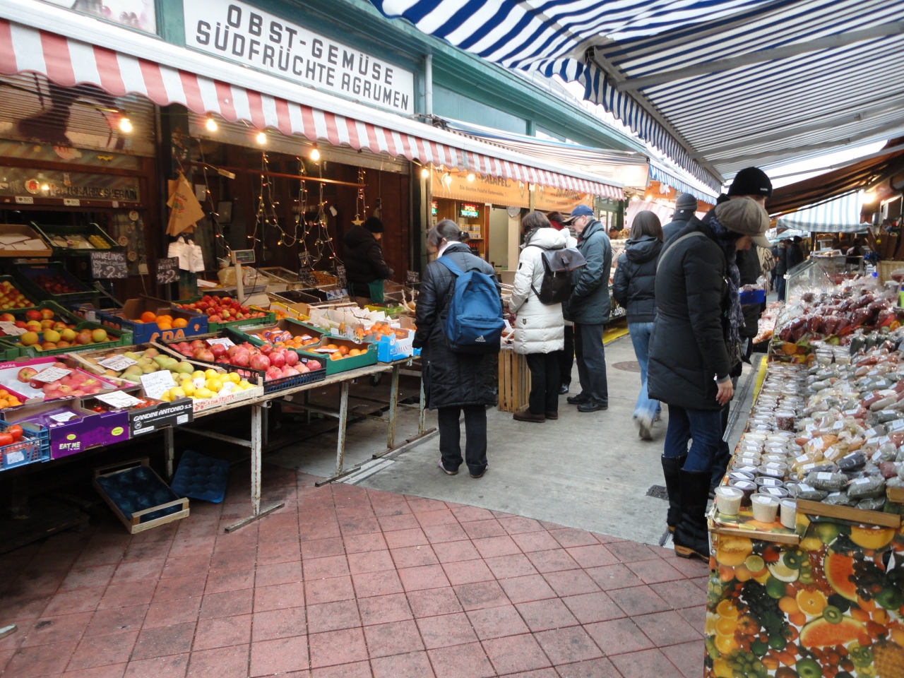地元の野菜・果物や乳製品にお菓子、世界各国の食料品を扱うお店が、細い通り道に居並ぶ市場。デリやレストラン、カフェもあります。