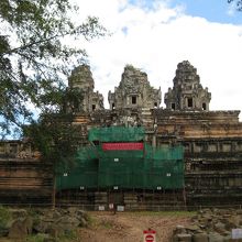 ここは現在修復中ということで内部には入れず、外から全体を見ましたが、かなり高い建物です。本来は正面にある急な石の階段にも上れるそうです。ここは「クリスタルの古老」という意味を持ちアンコールワット造営の試金石として建てられたらしいです。また途中で王が急死して石材を積み上げた状態で未完成のまま放置されているということです。しかし、外から見る限りはかなり壮大な建物で圧倒されます。次回は修復が終わった状態で内部に入りたいですね。