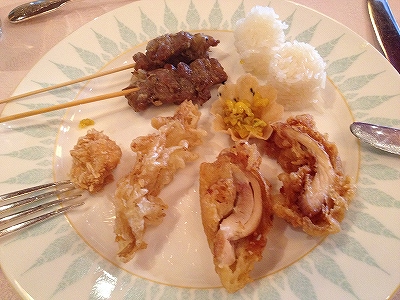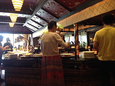 週末プライス、食事だけで1200バーツ(3600円)というには、ビュッフェの品揃えは貧弱で、かなりガッカリしました。何よりも驚いたのが揚げ物料理がずらっと並んだコーナー。鶏肉にエビにイカを衣をつけて揚げただけ。タイ風のソースが数種類並んでいたものの、料理自体はタイ料理でもなんでもない。もしかして、他のビュッフェレストランと併用してるのかも、と思いました。