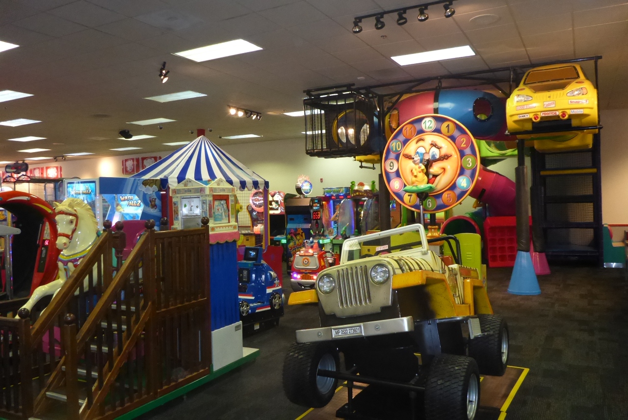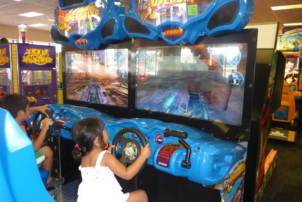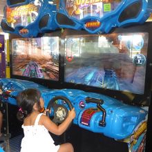 ピザが食べられるゲームセンターみたいな場所です、グアムプレミアムアウトレットの敷地内フードコートを出て直ぐの所にあります、店内は大きな音楽がかかっています、誘拐防止等の為か入口で人数の確認があり特殊ライトを当てると光る番号を腕にスタンプします帰りも同じ人数番号でなければ退場できないシステムです。ピザやチキンウイング等と一緒にゲームのコインを購入して楽しめますしピザも普通に美味しくいただけます、注意してほしいのは店内の冷房がとても寒いのでなにか羽織るものなどあったほうが良いと思います。