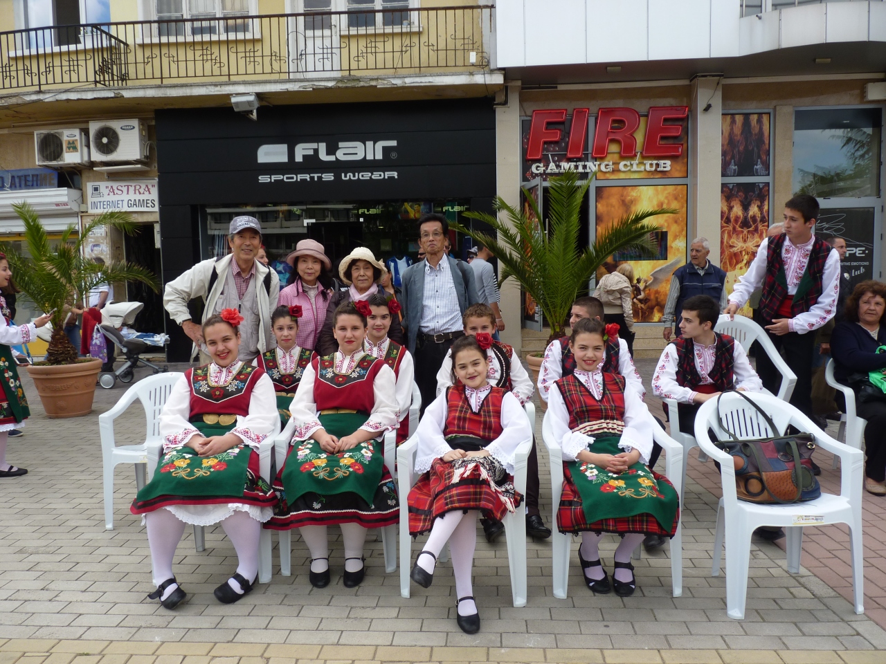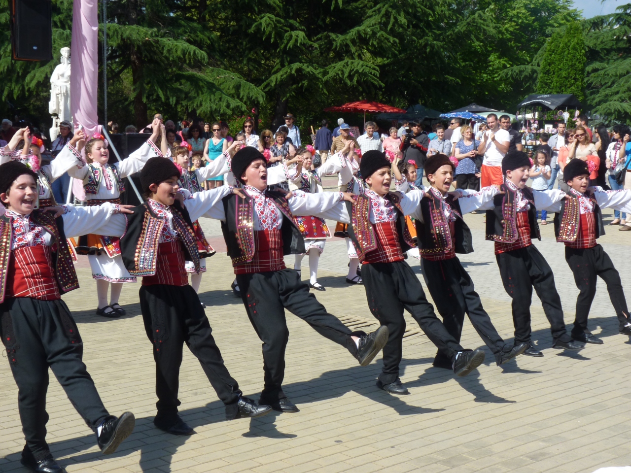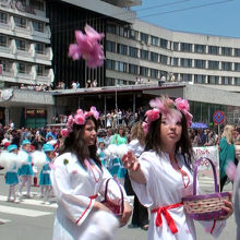 きらびやかな衣装と民俗舞踊を競って披露するパレードがメインストリートを交通制限して始まり、今年のバラのクイーンがオープンカーに乗り、愛嬌を振りまく。オープンセレモニーの前に偶然ブルガリア大統領(バルバノフ)と出会い、歓迎の言葉を受けるハプニングあり!!パレードの通路はバラの花が舞いその香りをかぎながら観戦する。