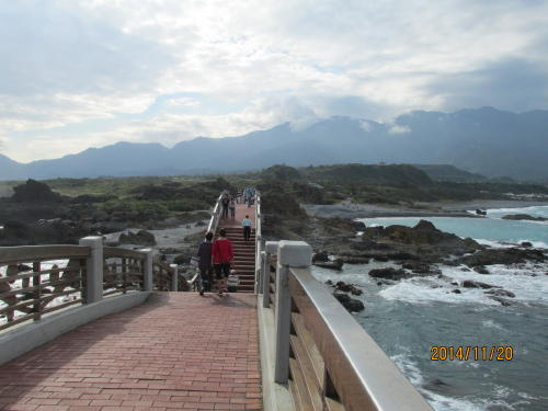 台湾ぐるり1周5日間、格安ツアー(HIS)3日目は高雄から台東を経て花蓮まで「峠越え」の路です。台東で昼飯を食べた後、三仙台を観光します。台東市の北方約65kmにある巨大な三つの岩か並ぶ観光名所。元々は火山岩からなる岬が、海水の浸食を受け先端が離れ小島となった。伝説によれば、3人の仙人がこの地に滞在した際の痕跡がこの島の中央にある3つの巨岩でこのため三仙台と言うそうです。島には岩国の錦帯橋みたいな橋が八つ連続して架かっています。登ったり降りたり、行ったらまた戻って来なければなりません。とても疲れる橋です。時間も無いので中程で戻って来ました。近くに北回帰線もありました。通過証明書も発行してくれました。