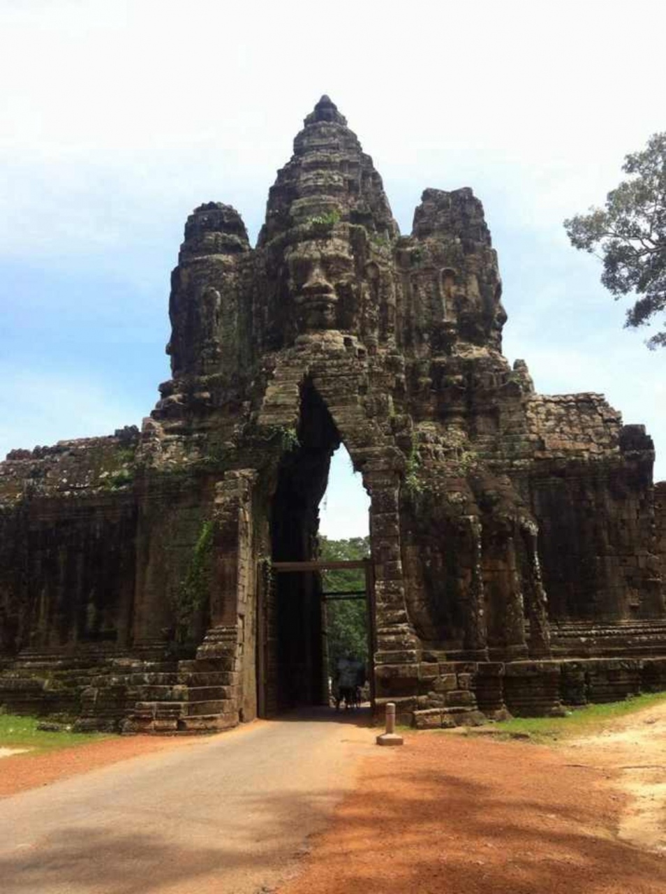 アンコール・トムの正門は南であり。南大門と呼ばれる、大型のバスが交通禁止している。他の門より素晴らしいです。12世紀末頃にジャヤマルマン7世王により建造された。大乗仏教を捧げた。1432年にアンコール時代を崩壊後に密林の中で囲まれている。1994年からは観光客に訪れて始まった。
