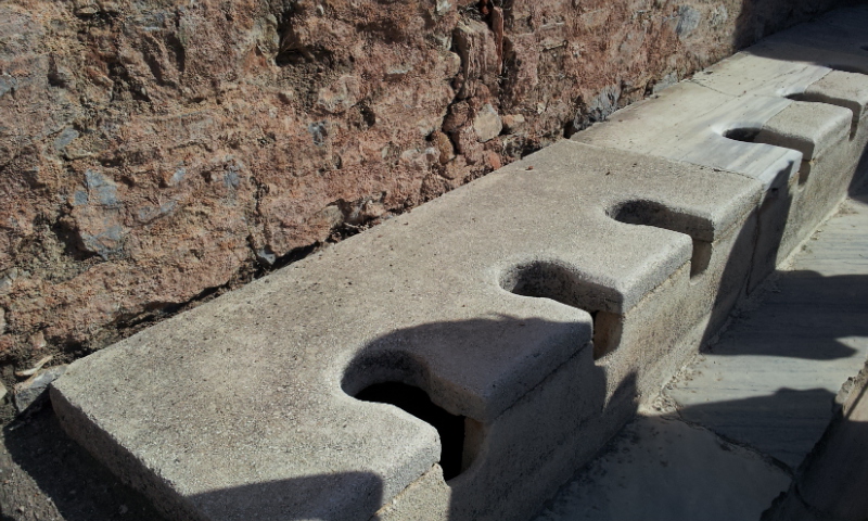 壁に沿って、なんの仕切りもなしにトイレが並んでいます。