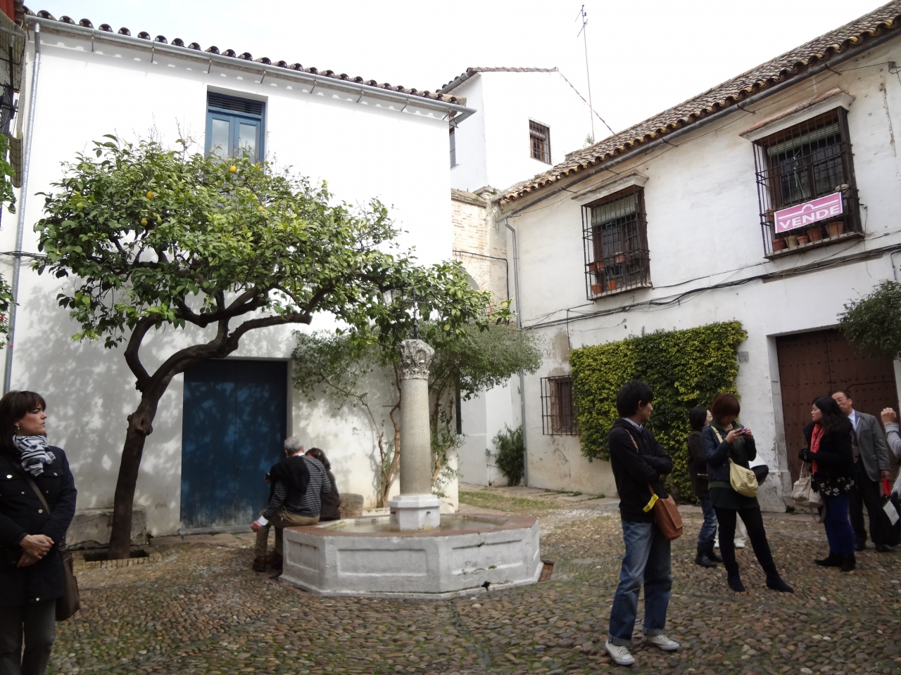 白い家が並ぶ、とてもきれいな街並みが印象的。中でも花の小路はすばらしいです。つきあたりの広場から花の小道を撮影すると向こう側にメスキータの尖塔が見えています。
