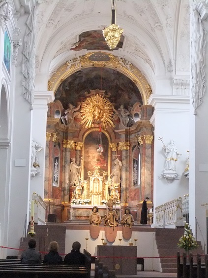 白を基調とした内部空間におきまして、中央の祭壇が金色に輝いていました。日本語のパンフレットがあることに少し驚いてしまったのですが、後から思い返してみるとヴュルツブルクでは想像していた以上に日本語を見かけたという印象です。