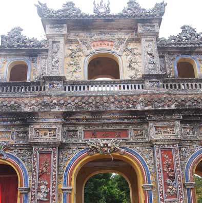 北京の紫禁城を模したとされる阮(グエン)王宮の東西南北の門のひとつで東側にある門が顕仁門です。二段になった門構えは細かい彫刻や青・赤・黄を中心とした彩色が施されていて他の門とは違った豪華さがあります。