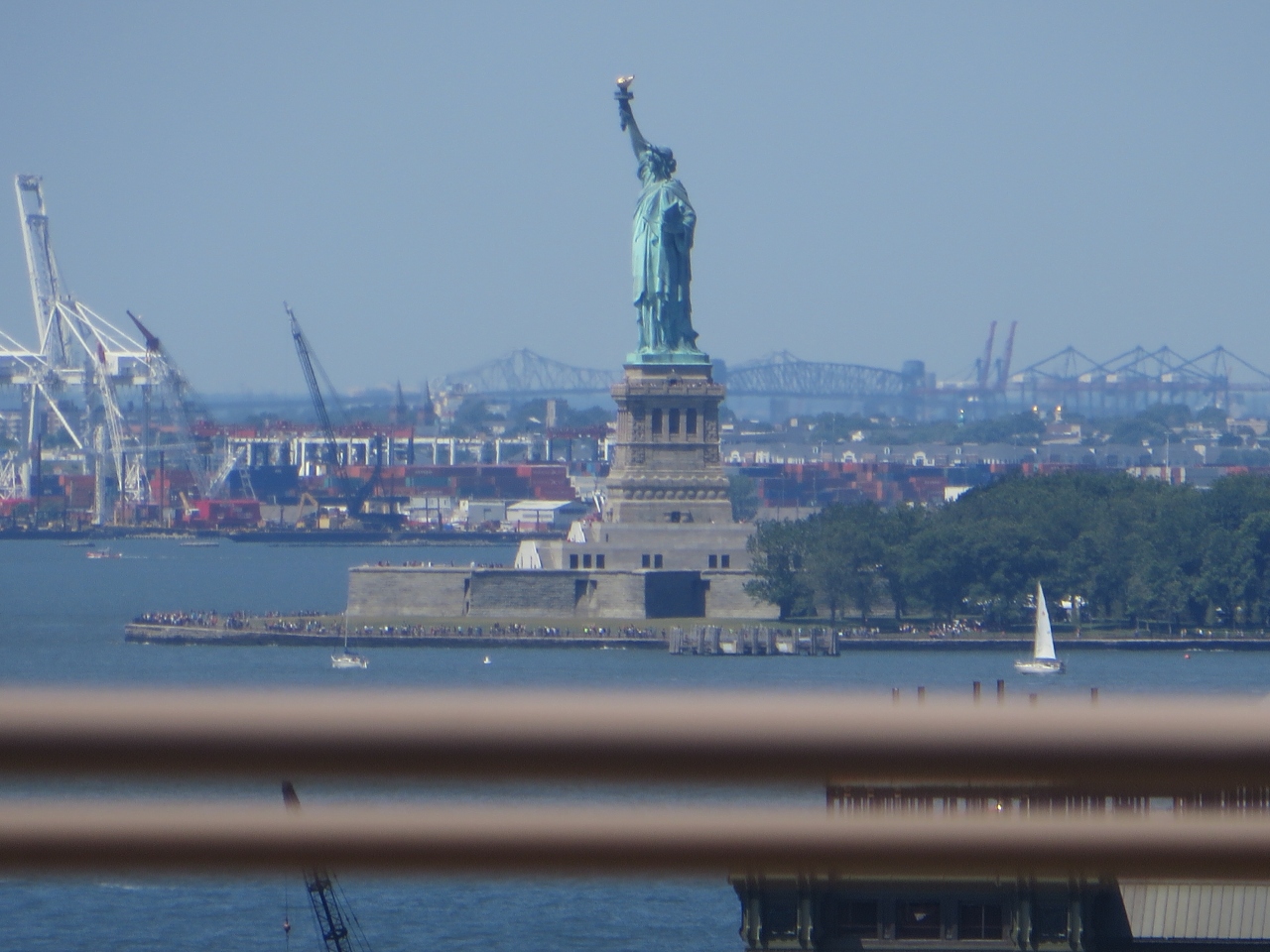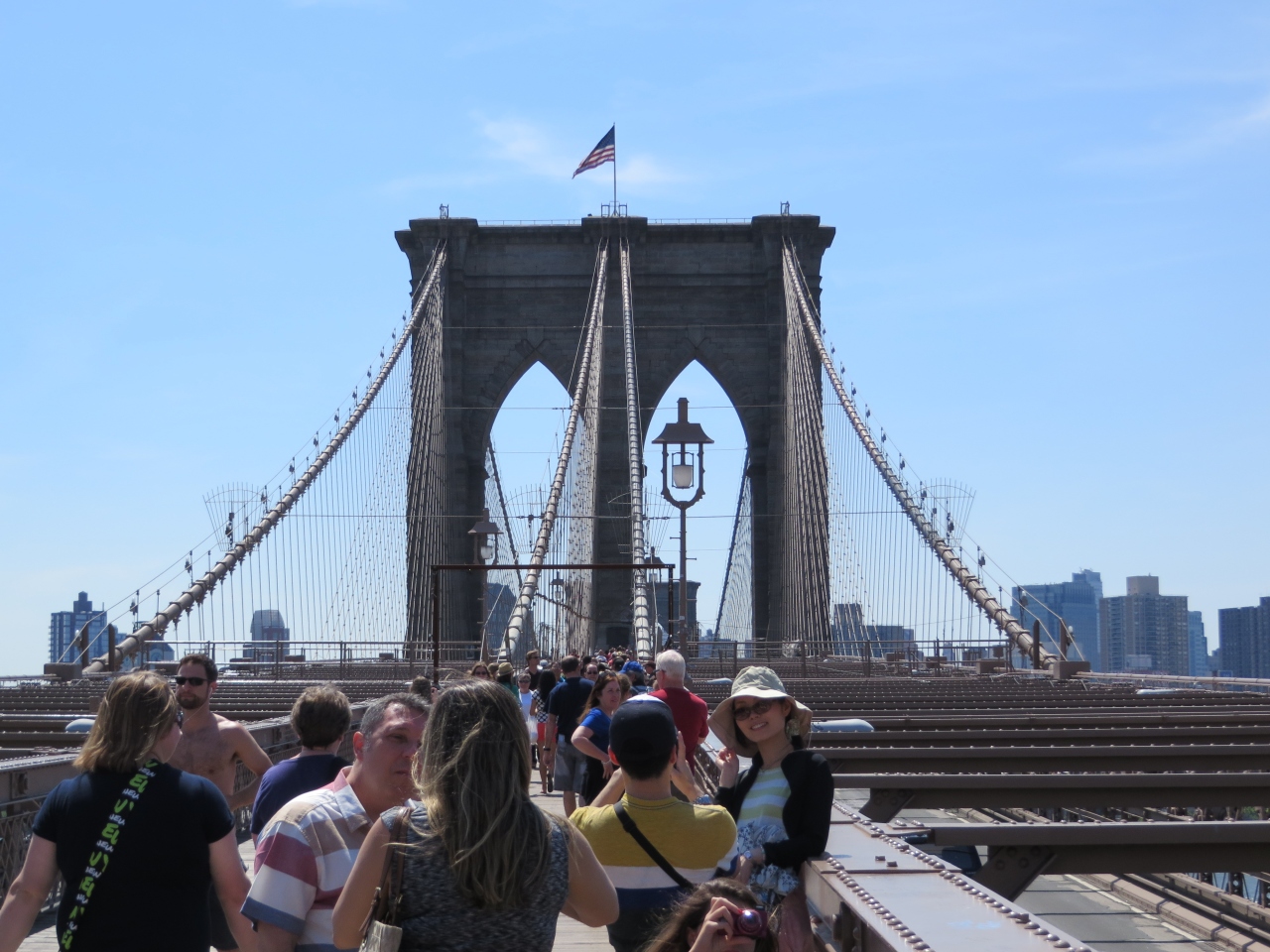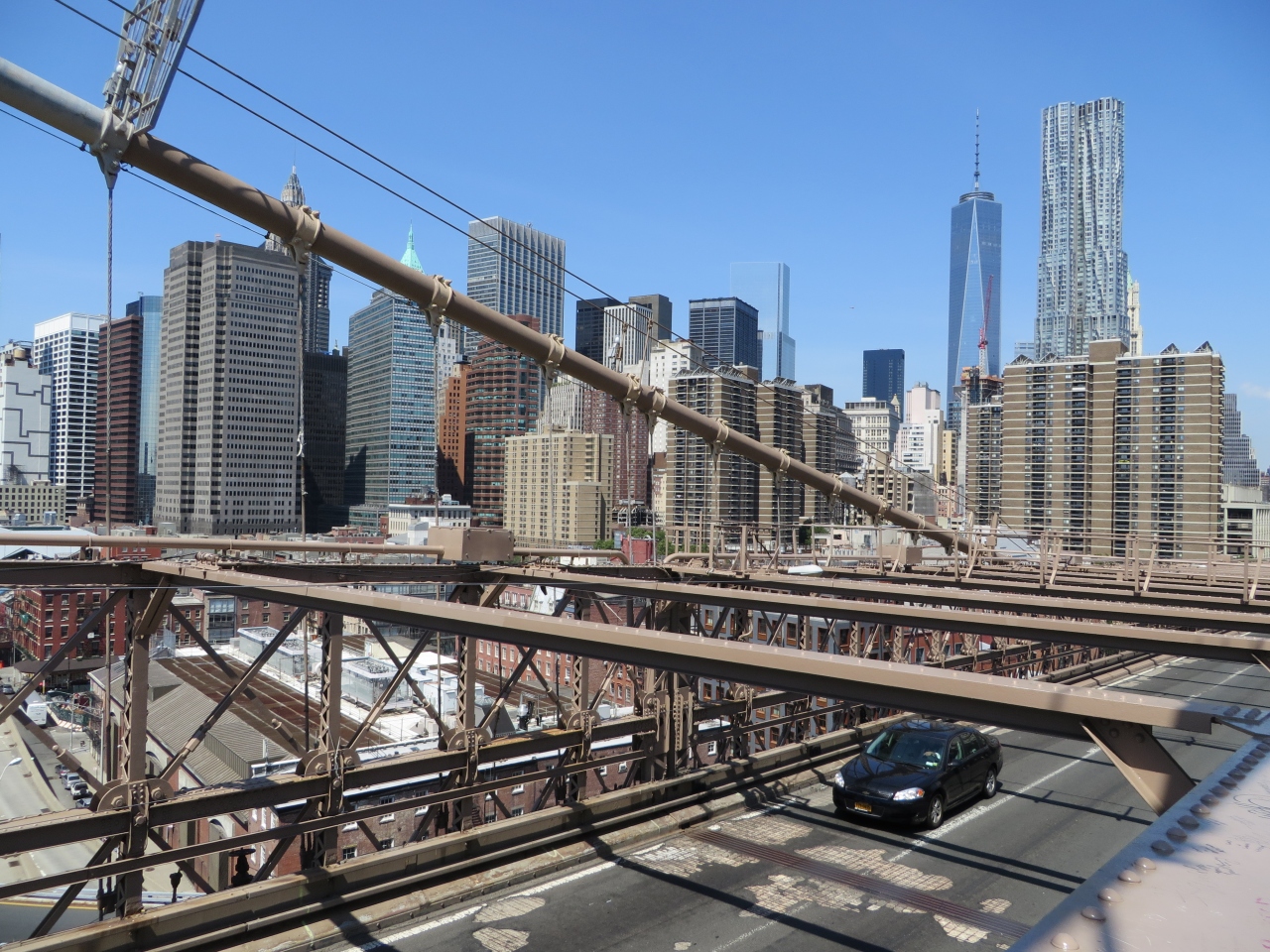 橋を渡り始めて後ろを振り返ると、まずWTCの再開発地域の新しく青色に澄んだビルが、さらに渡っていくとマンハッタンの高層ビルがそれぞれ見えてきます。