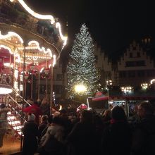 クリスマスマーケットの最初の日曜日に行って来ました。夕方5時頃に行ったのですが、日曜日なだけあって老若男女入り乱れて混みに混んでいました。市庁舎前のクリスマスツリー、え?これで30mもあるの?と思ってしまうくらい低く見えてしまいましたが、切妻の屋根の家を出バックにキレイでした。メリーゴーランドは二階建てになっていて圧倒されました。広場の周りにもクリスマスマーケットが開かれていますが、やはりレーマー広場のクリスマスマーケットが一番見応えがありました。