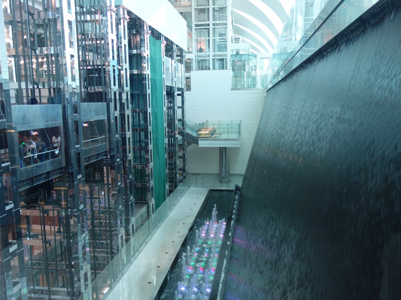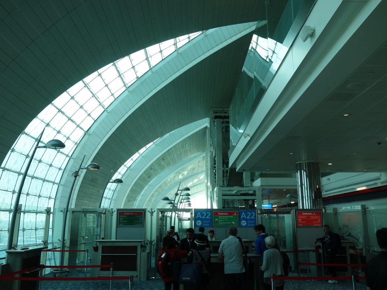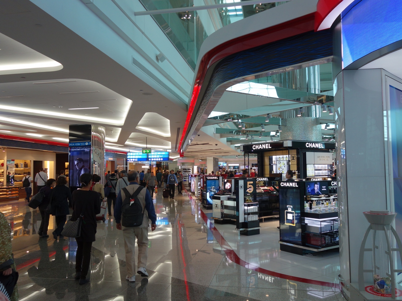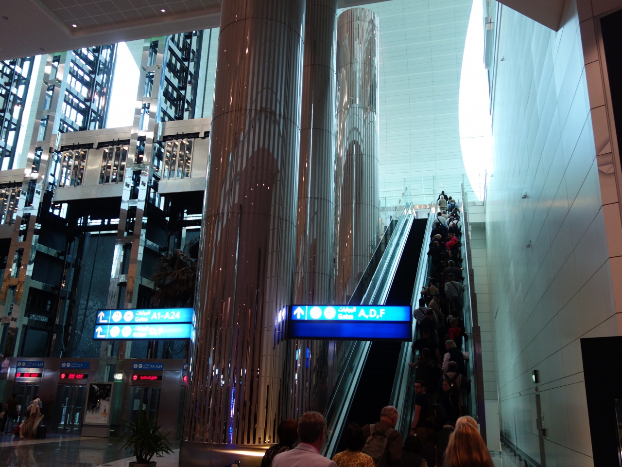 A380以外の飛行機の乗り降りはすべてタラップで,ターミナルまではバス移動ではないかと思わせる空港です。そのバスも,延々と乗るので,それだけで疲れます。ターミナル内の移動も,無人電車のようなものの,エレベータ,エスカレータ等々いろいろと乗り継がないとできません。とにかく巨大空港で,人間のスケールとはあいません。十分注意して移動してください。