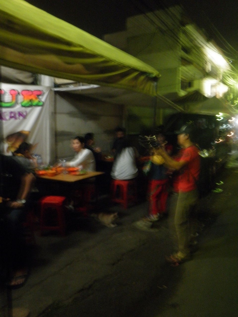 インドネシアから日本に帰るとき、ジャカルタの安宿街のジャラン・ジャクサで一泊しました。 この通りは夜が暗く、明るいのは日本でおなじみのコンビニ前くらいでした。 ここは店の前にイートイン・スペースがあってのんびりするのによかったです。