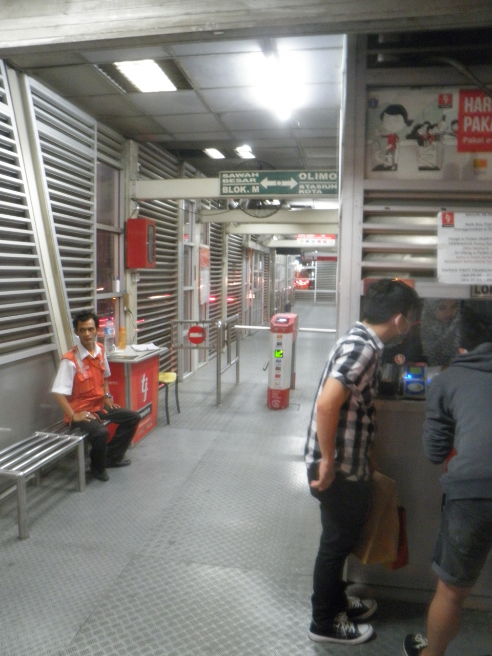 ジャカルタから日本に戻るとき、トランスジャカルタを利用しました。 駅が大きな道路の真ん中にある場合、長い歩道橋を歩いて渡りました。 プリペードカードを買う必要があると係員に言われて、明日帰るんだから1回だけのせてと繰り返しお願いすると、他の乗客に現金を渡して、その乗客のカードで乗車することになりました。