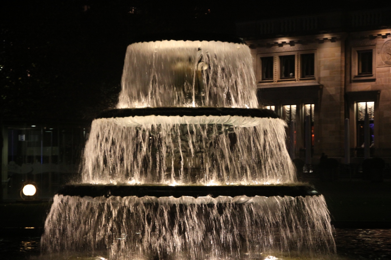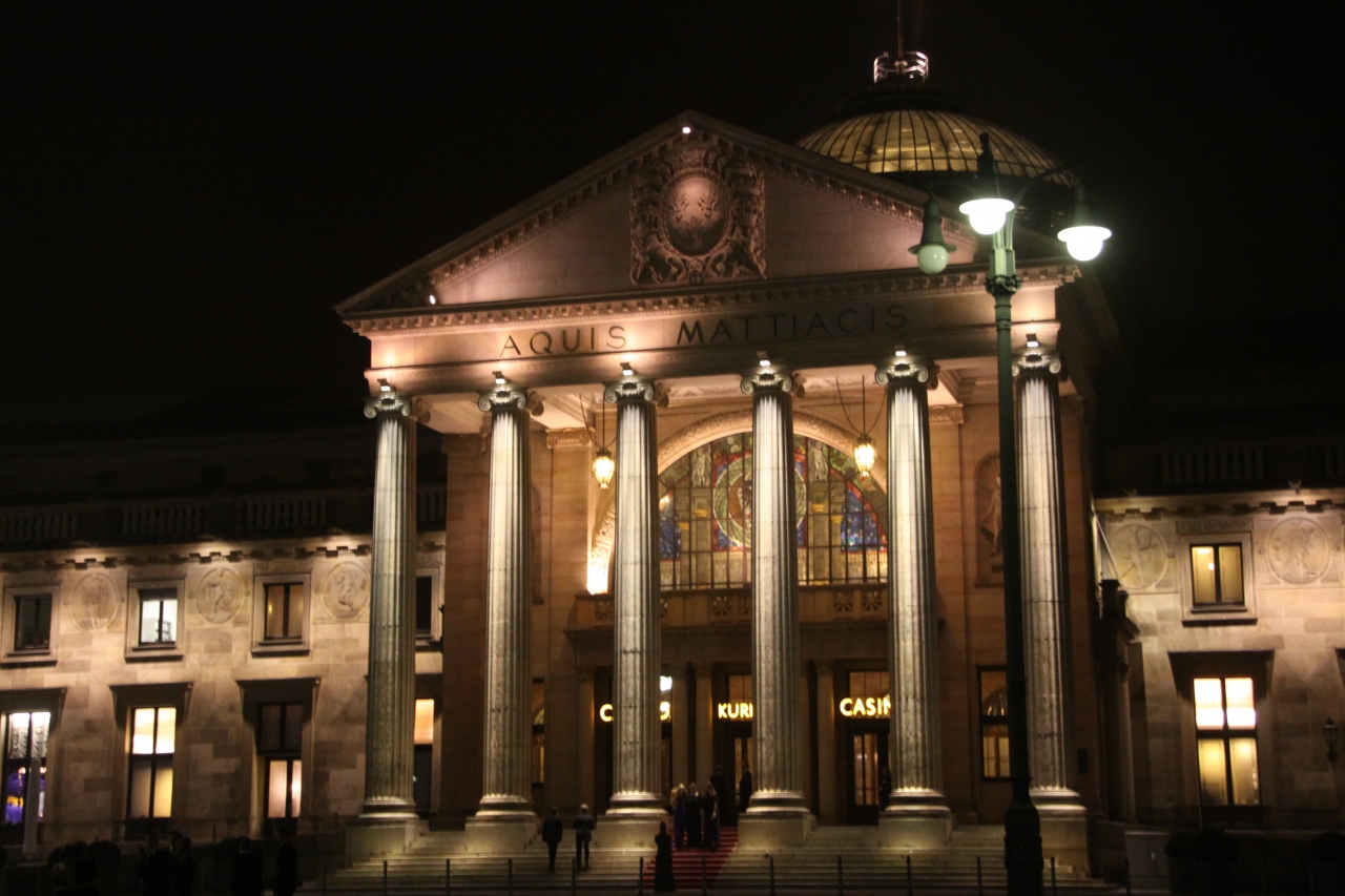 夜にカイザーフリードリヒ温泉を訪れた帰りに寄ったのですが、入口付近で記念写真を撮っていた男女がみな正装をしており、ダウンジャケット姿の自分はとても入れないと思ってその場を立ち去りました。ライトアップされたカジノは華やかな雰囲気を醸し出していました。