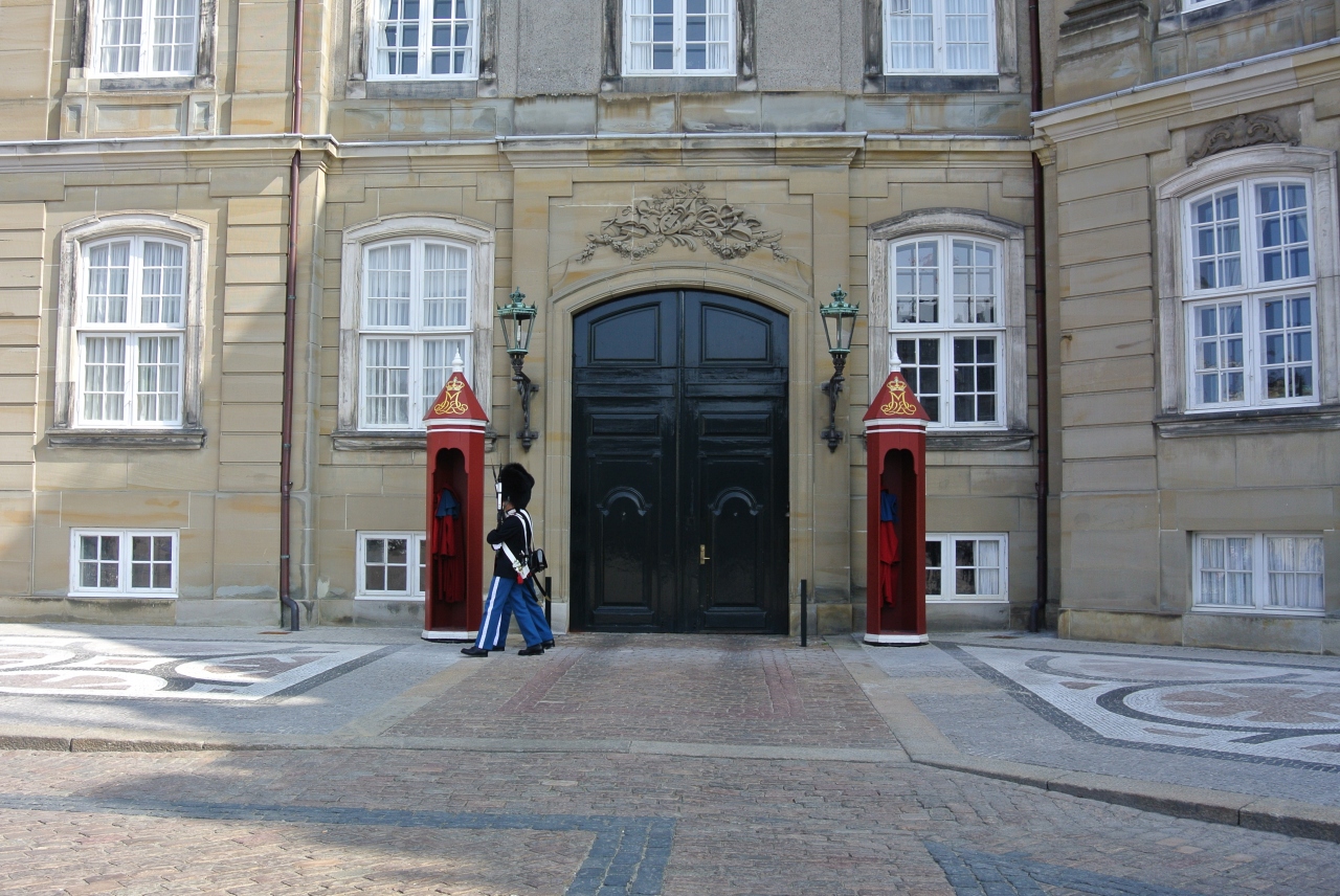 広場の周りを4つの建物が囲む形になっています。女王の居城に旗が立っている時は女王が滞在しているそうです。大きな帽子をかぶった近衛兵も有名ですね。広場の中央にはこの城を造営フレデリック5世の騎馬像が立っています。