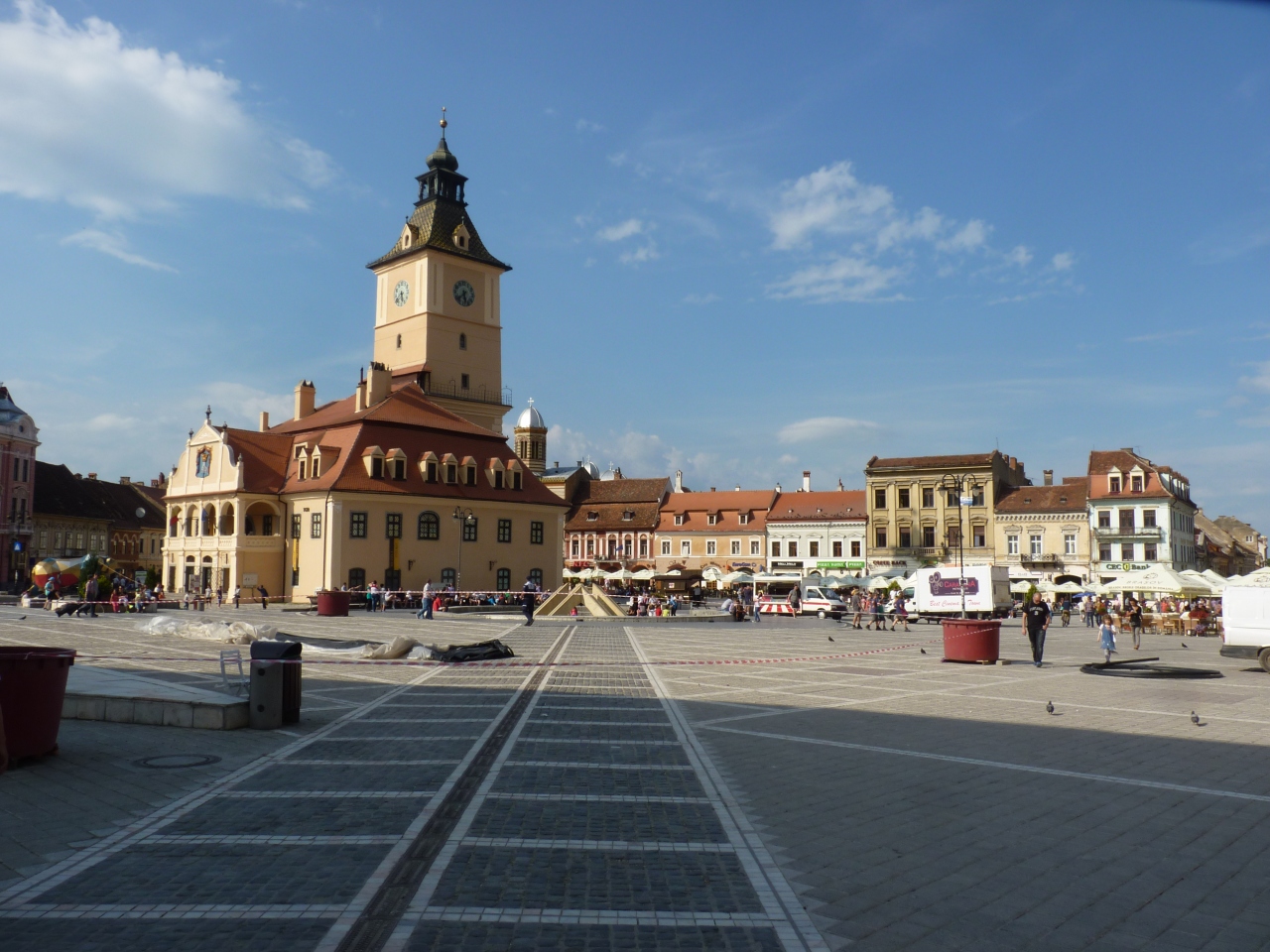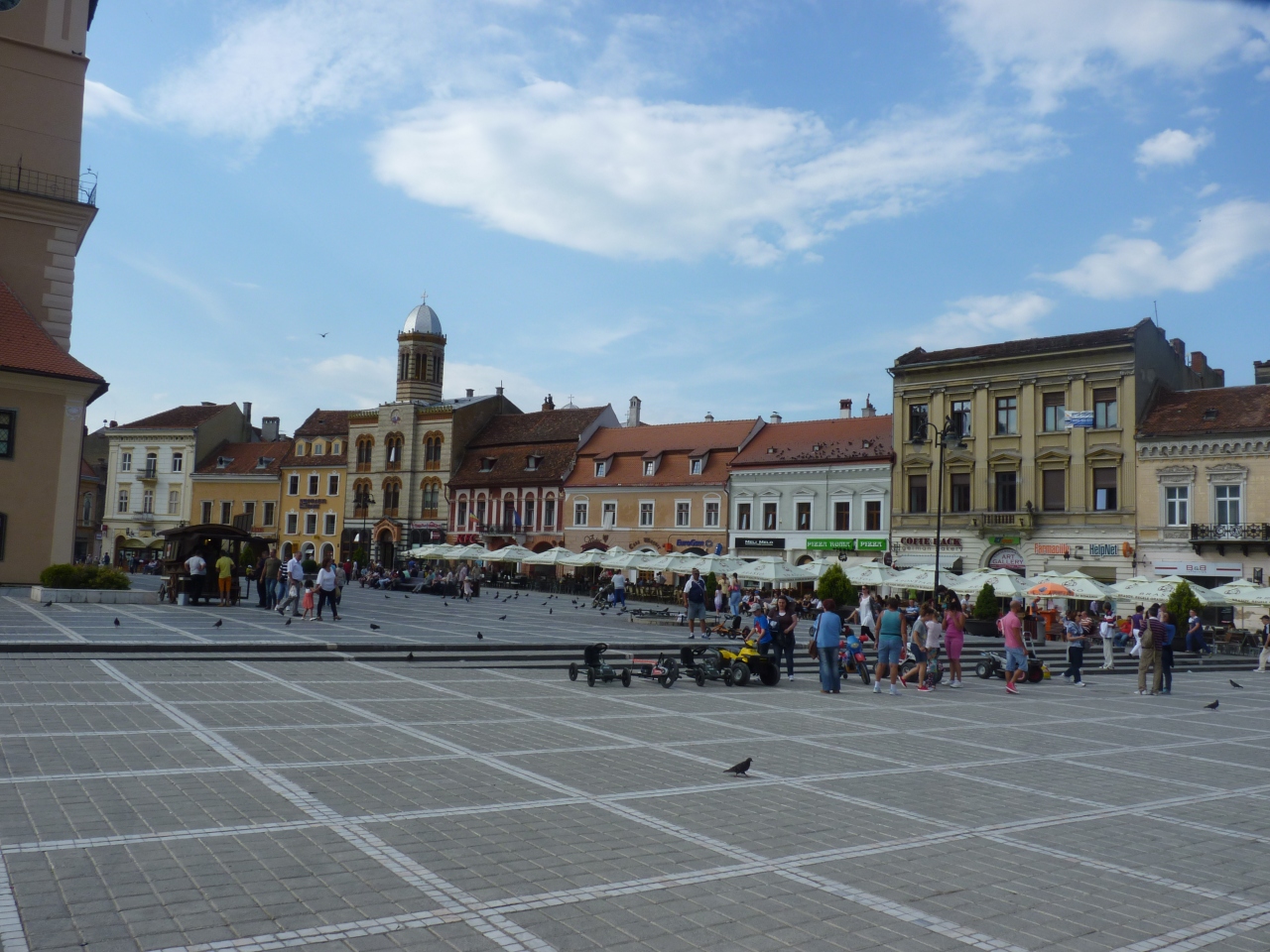 街の中心には、駅前から4番のバスに乗ると10分ほどで着く。タクシーで行くと約5分で着き3RONでいけた。この広場の中心には噴水が上がりいつも大勢の観光客や市民の憩いの場となっている。隣には黒の教会や旧市庁舎、インフオアメーション、ショッピング街が並ぶ。