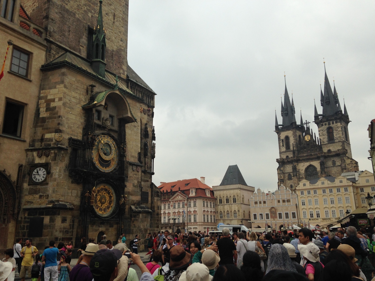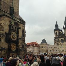 天文時計のからくり時計は、決まった時間になると動き出しますが、それ目当ての観光客の人だかりがすごかったです。