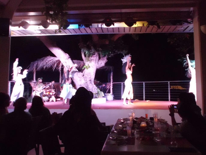 ヒルトンのオープンテラスでバーベキューを食べながらポリネシアンダンスとファイヤーショー鑑賞。BBQは焼き上がったものをビュフェスタイルでいただきます。海老、豚、スペアリブなどなど。日本人の好きなマグロの刺身や蕎麦、寿司もあります。ショーは何人かお客さんがステージの上げられてダンスや楽器の演奏を一緒にしてみるコーナーもあり。