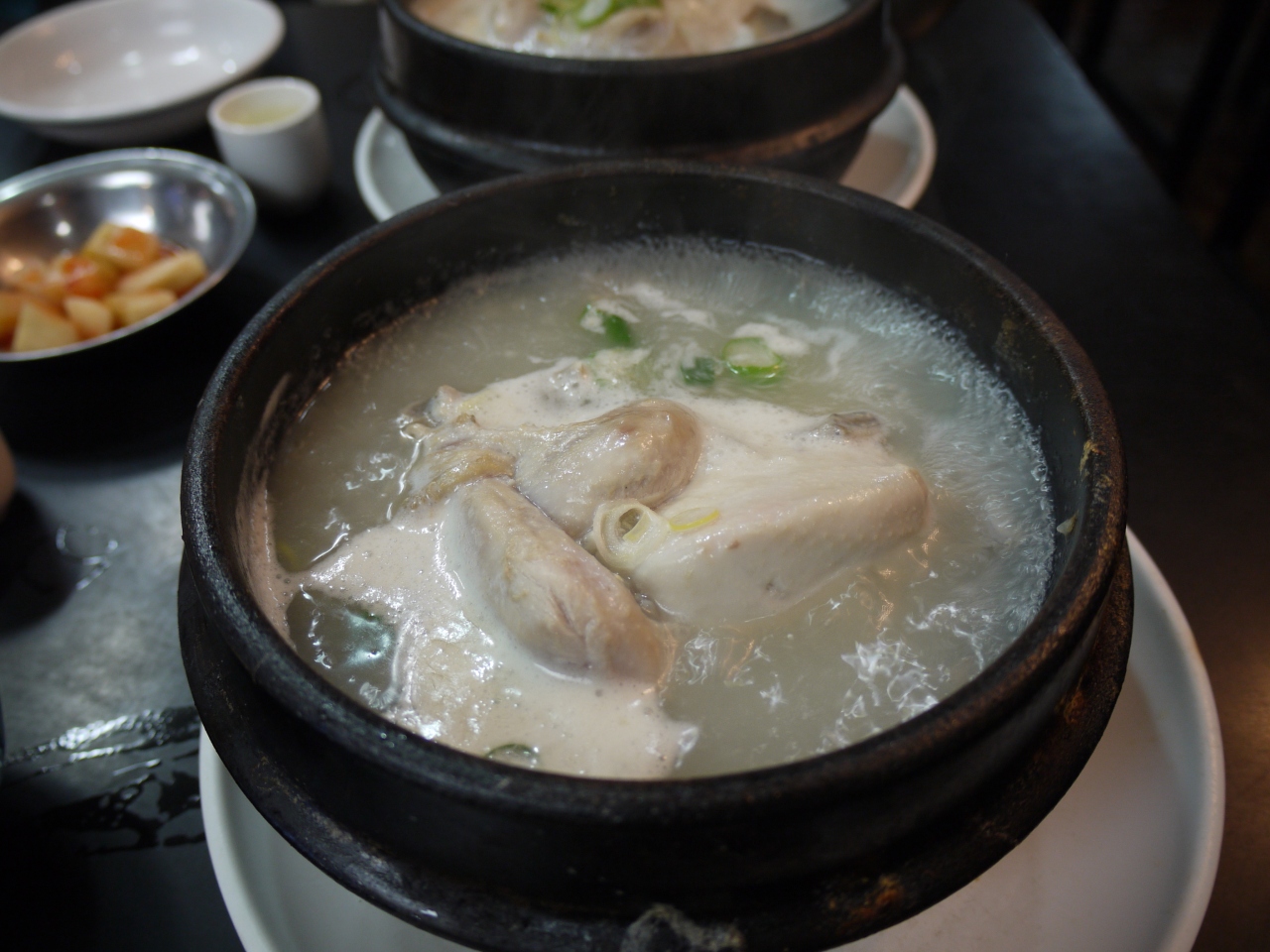 口直しに「百済参鶏湯」へ。しきりに烏骨鶏の「オゴルゲタン」を勧められましたが、強引に普通の「サムゲタン」14000Wと「人参入りサムゲタン」18000Wを注文しました。しかし、味がさっぱりすぎで口に合いませんでした。スーパーなどで売っているものの方が濃厚でとろとろで美味しかったので残念でした。