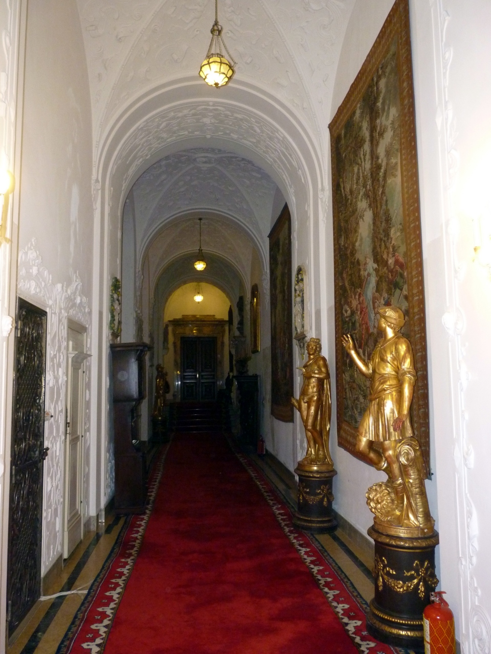 シナイヤ駅より徒歩で15分くらいの登り道を行くとペレシュ城に到着する。流石人気の城だけあって入場口は観光客でごった返し、順番に人数を制限して入れている。カロル1世がルーマニア王室の夏の離宮として8年の歳月を費やし建てた宮殿でルーマニアで最も壮麗な城として称えられるほど美しい城といわれている。内部見学はツアー形式で行われ各部屋の絵画、彫刻、陶磁器、金銀宝飾品、中世の武器などは見ごたえがある。