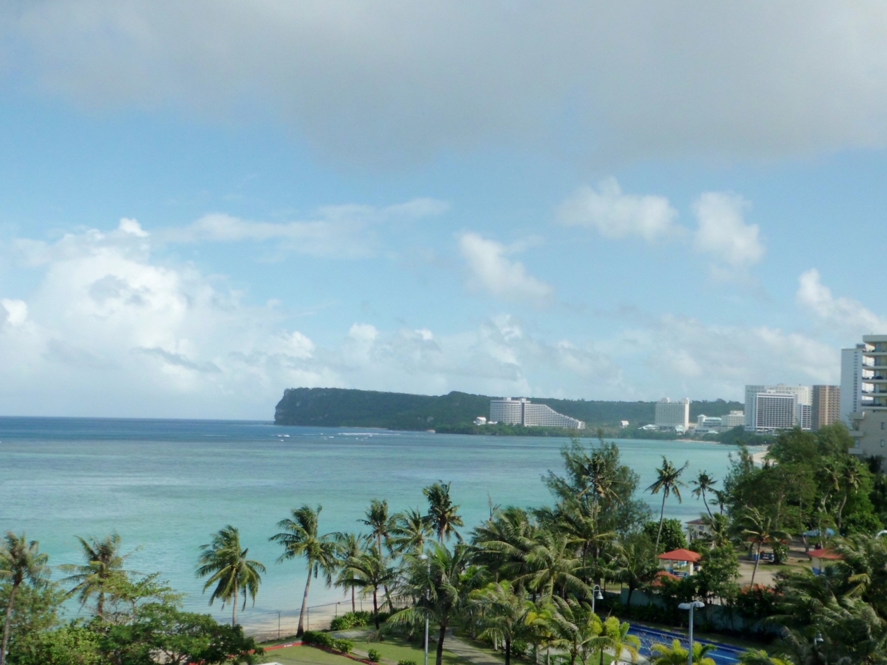 リゾートホテルが並ぶタモン湾。ゆったりと弧を描いている海岸線です。いくつか名前のついている海水浴場があります。遠くに恋人岬も見えてなかなかの景色。サンゴのまわりに魚がいるので足のつく場所でも楽しめました。小さなお子様はライフジャケット着用で。