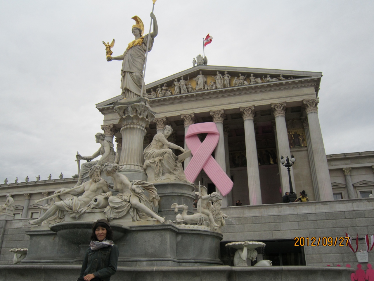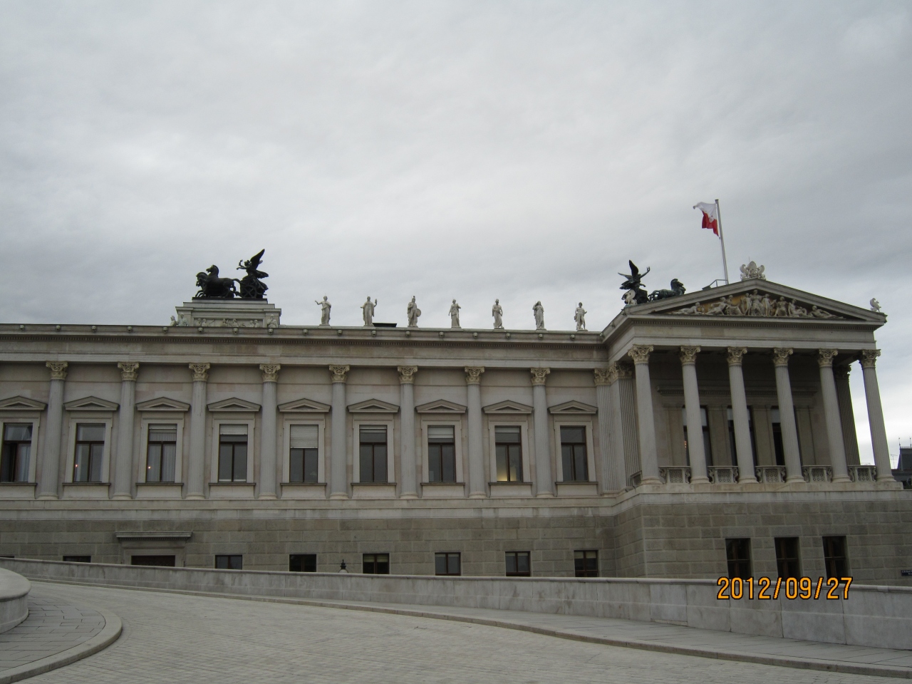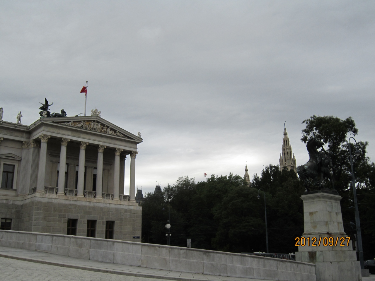 地下鉄のカールスプラッツ駅で降りて、リンク沿いに歩くと、左手に古代ギリシャ神殿を思わせる荘厳な建築物が現れます。皇帝フランツ ヨーゼフ I 世の時代に建てられました。議事堂の前にはアテナ噴水があり、女神アテナ像の周りにはオーストリアハンガリー帝国に関係する彫像が並んでいます。屋根の上には 4 台の戦車があり、周りは 100を超える彫像で飾られています。王宮、市庁舎も目の前です。