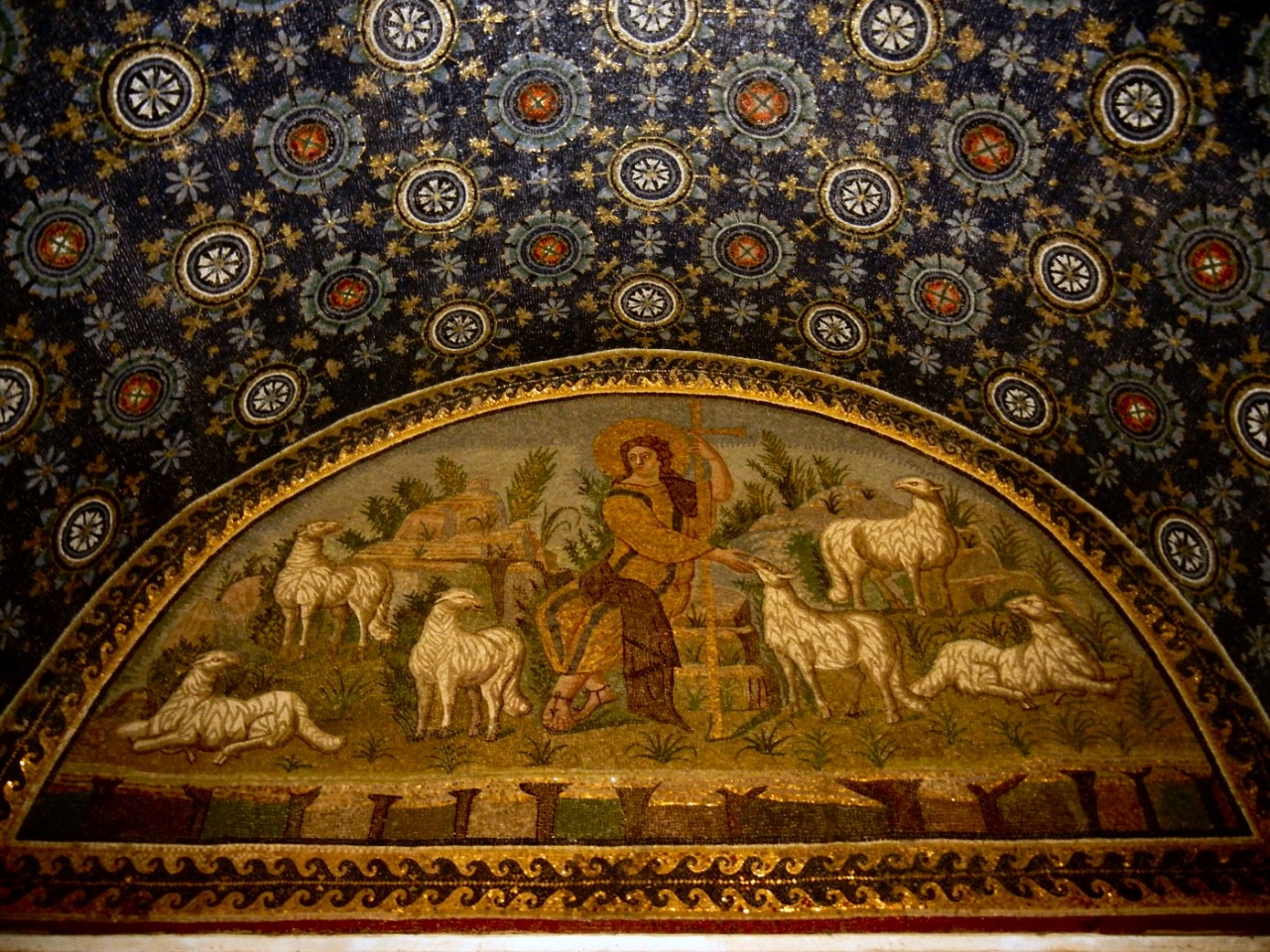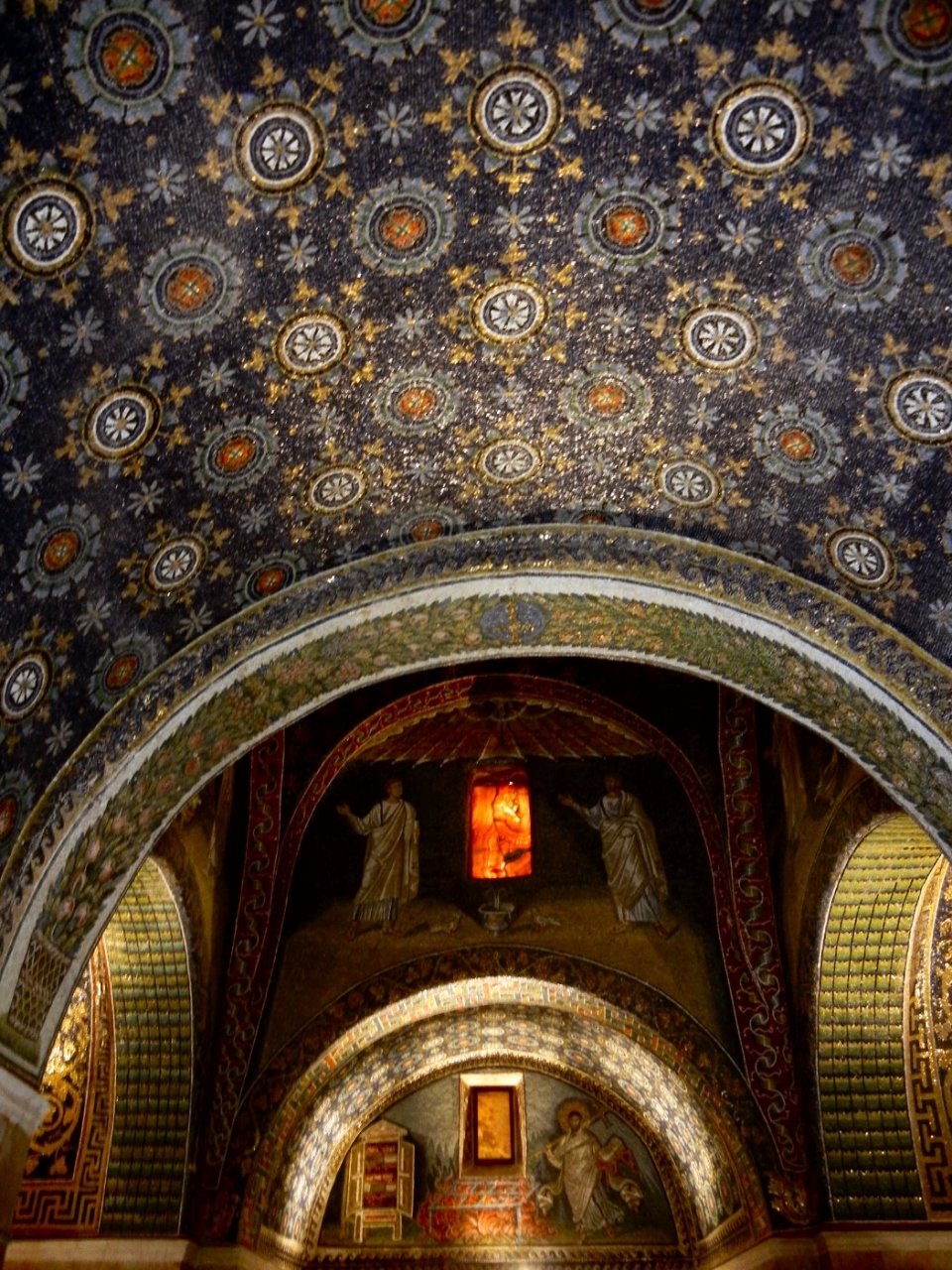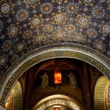 しかし、中に入ると幻想的なモザイク画に言葉を失う。天井は青く染められ、無数の星がきらめく。横たわる死者が仰ぐのは十字架。天使や聖獣が見守る。まるで日本の装飾古墳をもっと豪華にしたような感じ。また行きたい。
