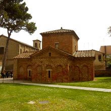 サン・ヴィターレ教会の建物を出ると、同じ敷地内の右手にレンガ造りの小さな家が建っている。これがガッラ・プラチーディア廟。サン・ヴィターレ以上にパッとしない建物。