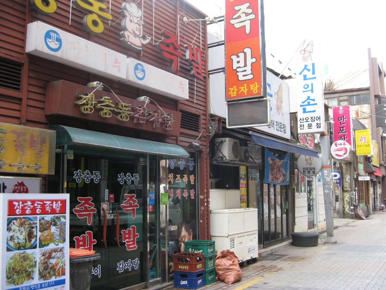 西面にあるホテルに宿泊したので、このエリアで食べたりしました、飲食店がたくさんあり、便利です。24時間営業のところもたくさんあるので助かります。ただ日本語や英語でも会話でのやりとりが出来ないお店も多かったので、ハングルが少し出来たらいいかもしれません。