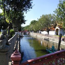 白亜の寺院。壁や柱が大理石で作られているため陽の光を受けて輝いていました。屋根の瓦がまた鮮やかなオレンジ色で寺院の様は美しいの一言です。本堂の正面入口では20Bのチケットの有無を確かめられますが横や裏にも出入口がありそこからだとチケットなしでも普通に入れます。本堂を取り巻く回廊にはタイ国内、世界各地の様式の仏像が並べられていますがレプリカなので今一つ迫力が感じられません。寺院の庭も広くとてもきれいに整備されて芝生も植えられています。運河を模した池もあり、とにかくこの寺院は美しいです。