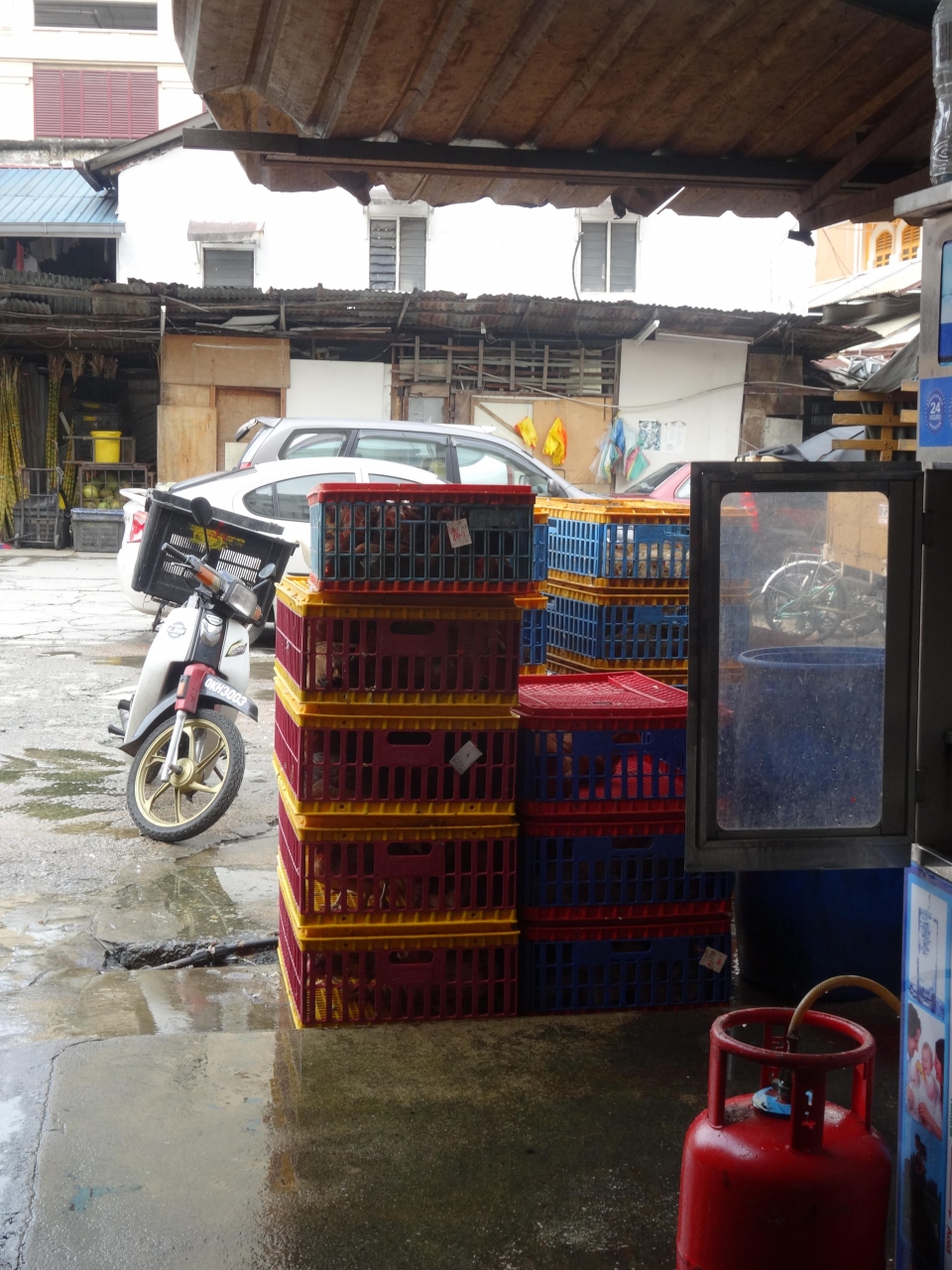 生きている鶏の入ったカゴが積み上げられている隣で包丁をさばいていたりして
