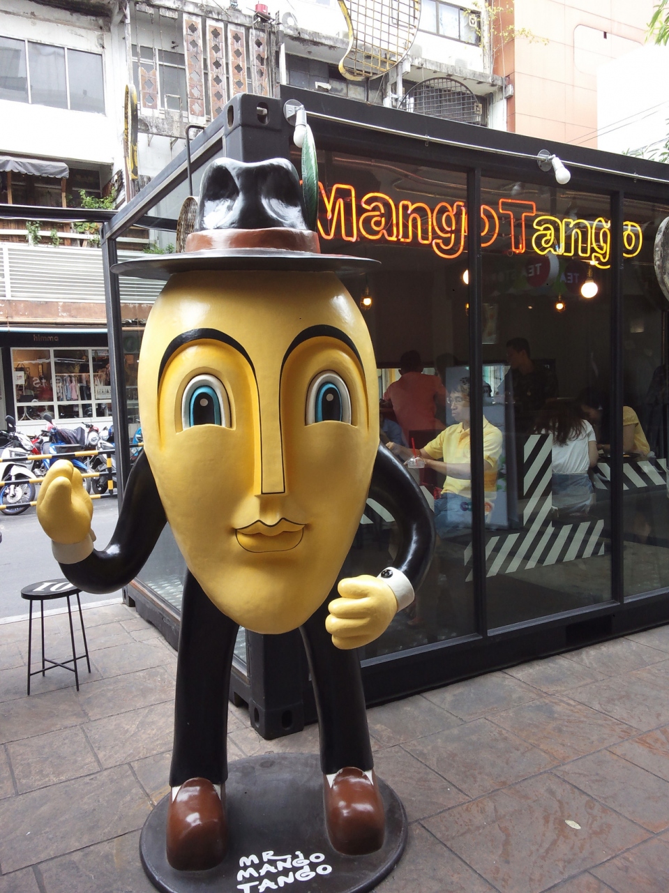 マンゴータンゴは、カットマンゴー、マンゴープリン、マンゴーシャーベットのセットで140Bです。左の店で注文して中に入って支払い、右手のプレハブに入って食べるか、外のイスに座って食べます。