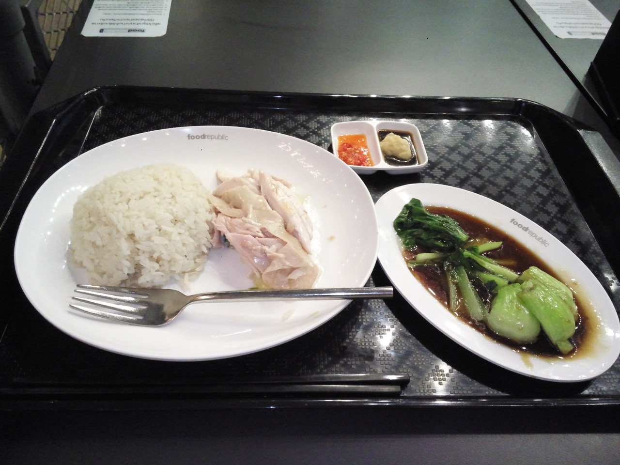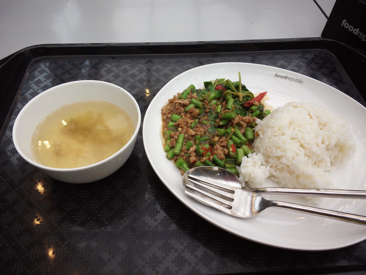 サイアムセンターのフードコートでチキンライス95B、豚肉とインゲンのバジル炒め50Bを食べました。屋台には抵抗がある人には清潔なフードコートはオススメです。