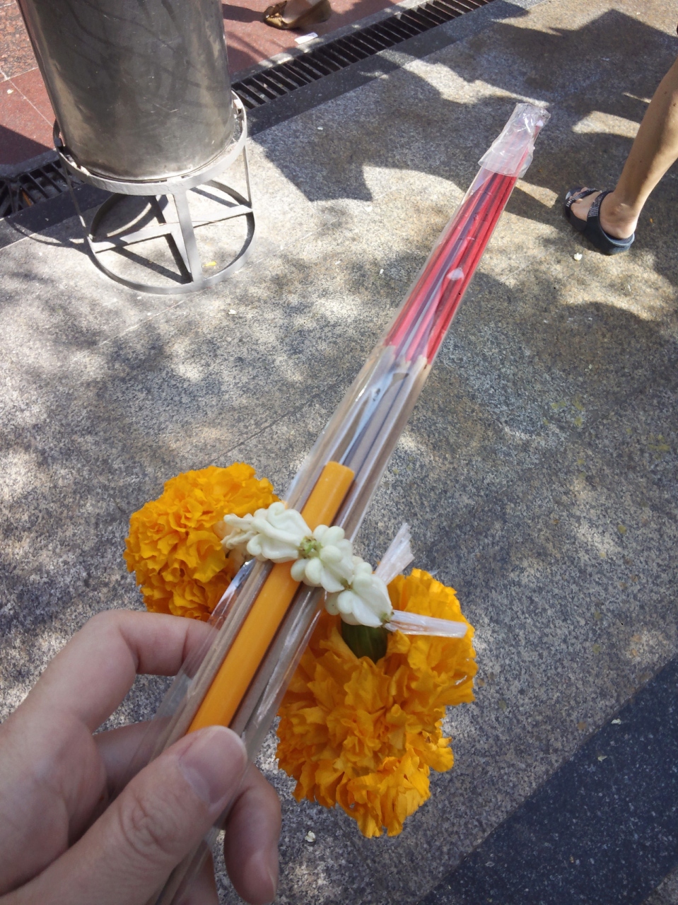 境内の右奥の売店でお参りセットを20Bで購入し、仏像の正面からお参りしました。仏像は4面あるので線香は4分の1ずつ置くようです。お花は適当な所に掛けました。ろうそくの扱いが分からなかったので、ろうそくが置いてある手前の段に立てました。