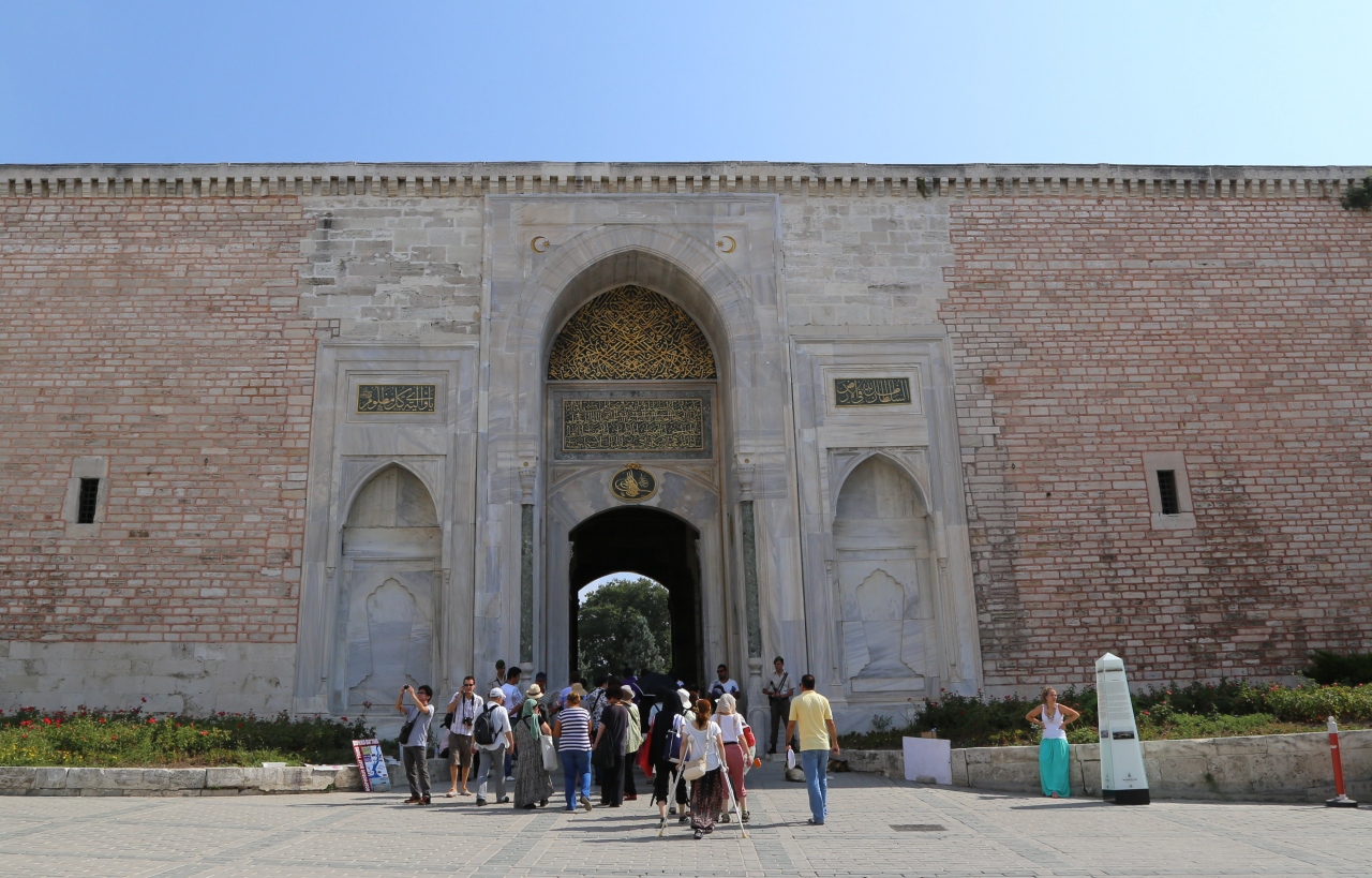 ブルーモスクを見学したあと、スルタンアフメット広場からアヤソフィアの裏を抜けるとトプカプ宮殿の最初の入口となる巨大な門が現れます。門というより城壁といった感じで威圧感たっぷりですが、宮殿に入るにはこのあとさらに別の門を通ります。